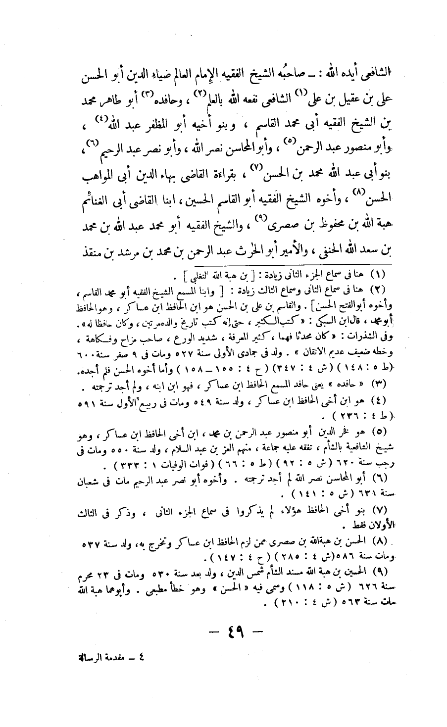 (٩) الحسين بن هبة الله مسند الشأم شمس الدين، ولد بعد سنة ٥٣٠ ومات في ٢٣ محرم سنة ٦٢٦ (ش ٥: ١١٨) وسمي فيه " الحسن " وهو خطأ مطبعي.