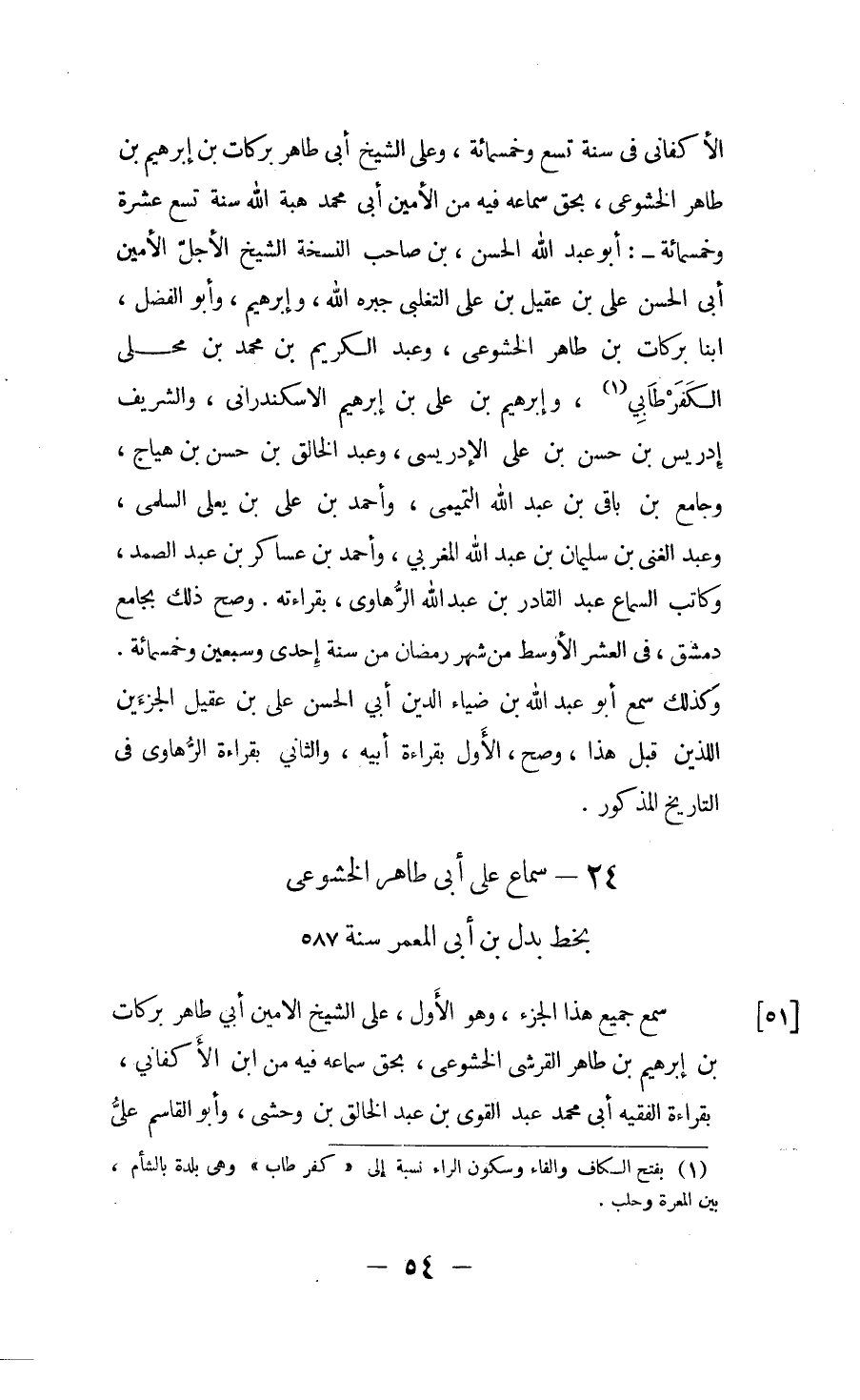 ٢٤ - سماع علي بن أبي طاهر الخشوعي بخط بدل بن أبي المعمر سنة ٥٨٧ سمع جميع هذا الجزء، وهو الاول، على الشيخ الامين أبي طاهر بركات بن إبرهيم بن طاهر القرشي الخشوعي، بحق سماعه فيه من ابن الاكفاني، بقراءة الفقيه أبي محمد عبد القوي بن عبد الخالق بن وحشي، وأبو القاسم علي