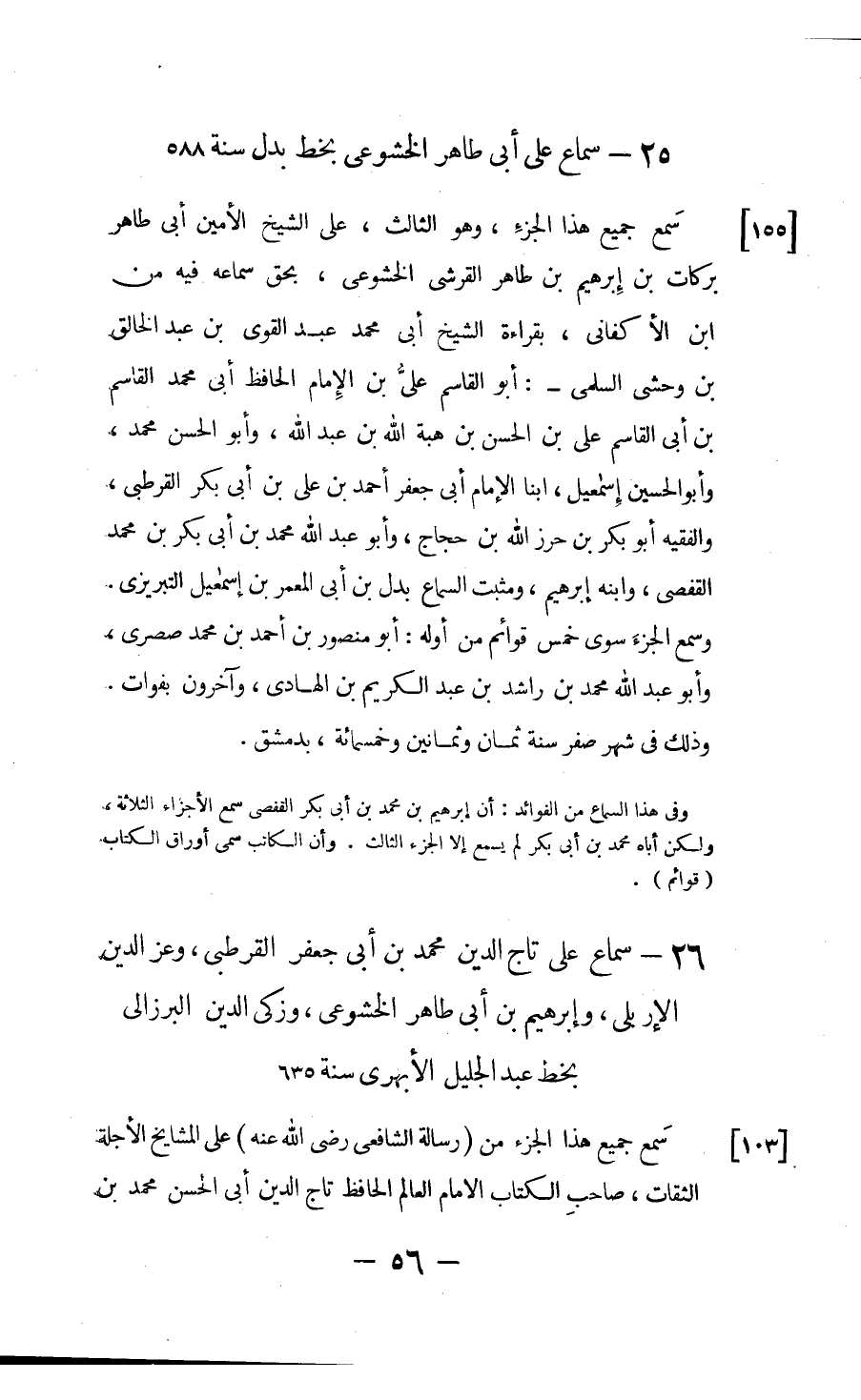 ٢٥ - سماع علي بن أبي طاهر الخشوعي بخط بدل سنة ٥٨٨ سمع جميع هذا الجزء، وهو الثالث، على الشيخ الامين أبي طاهر بركات بن إبرهيم بن طاهر القرشي الخشوعي، بحق سماعه فيه من ابن الاكفاني، بقراءة الشيخ أبي محمد عبد القوي بن عبد الخالق بن وحشي السلمي -: أبو القاسم علي بن الامام الحافظ أبي محمد القاسم بن أبي القاسم علي بن الحسن بن هبد الله بن عبد الله، وأبو الحسن محمد، وأبو الحسين إسمعيل، ابنا الامام جعفر بن علي بن أبي بكر القرطبي، والفقيه أبو بكر بن حرز الله بن حجاج، وأبو عبد الله محمد بن أبي بكر بن محمد القفصي، وابنه إبرهيم، ومثبت السماع بدل بن أبي المعمر بن إسمعيل التبريزي.