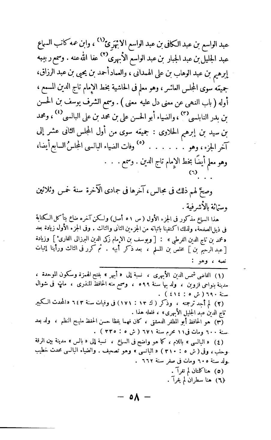 وسمع الشرف يوسف بن الحسن بن بدر النابلسي (٣) ، والضياء أبو الحسن علي بن محمد بن علي البالسي (٤) ، ومحمد بن سيد بن إبرهيم الحلاوي: جميعه سوى من أول المجلس الثاني عشر إلى آخر الجزء، وهو ... (٥) وفات البيضاء البالسي المجلس السابع أيضا، وهو معلم أيضا بخط الامام تاج الدين.