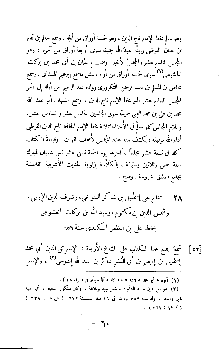 ٢٨ - سماع على إسمعيل بن شاكر التنوخي، وشرف الدين الاربلي، وشمس الدين بن مكتوم، وعبد الله بن بركات الخشوعي بخط علي بن المظفر الكندي سنة ٦٥٦ سمع جميع هذا الكتاب على المشايخ الاربعة: الامام تقي الدين أبي محمد إسمعيل بن إبرهيم بن أبي اليسر شاكر بن عبد الله التنوخي (٢) ، والامام