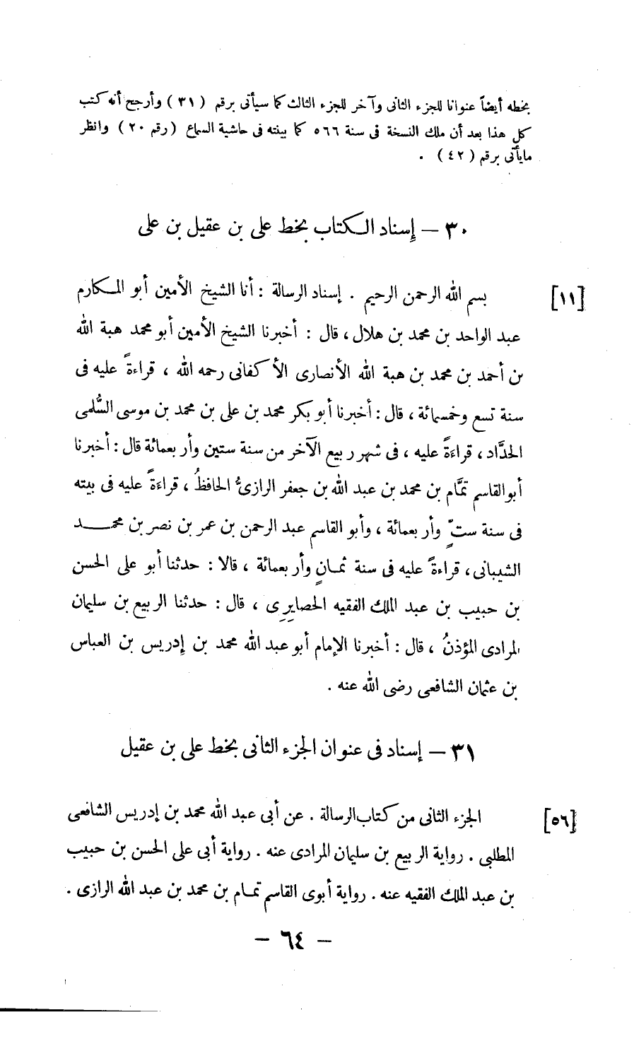 ٣٠ - إسناد الكتاب بخط علي بن عقيل بن علي بسم الله الرحمن الرحيم.