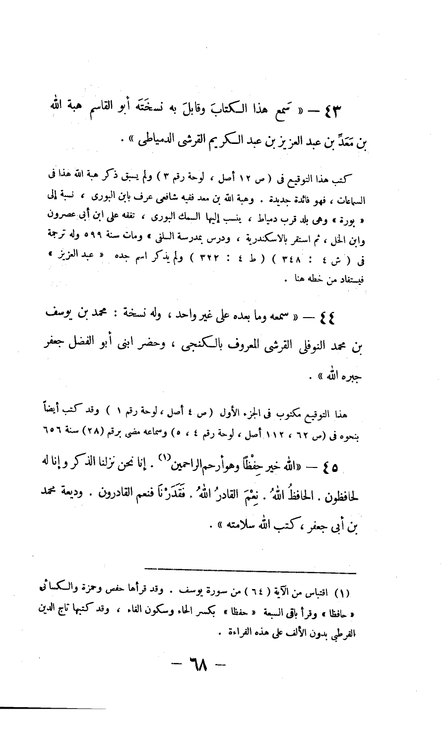 ٤٣ - " سمع هذا الكتاب وقابل به نسخة أبو القاسم هبة الله بن معد بن عبد العزيز بن عبد الكريم القرشي الدمياطي ".