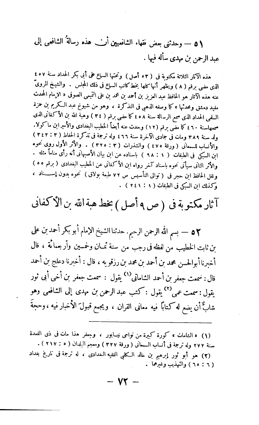 ٥١ - وحدثني بعض فقهاء الشافعيين أن هذه رسالة الشافعي إلى عبد الرحمن بن مهدي سأله فيها.