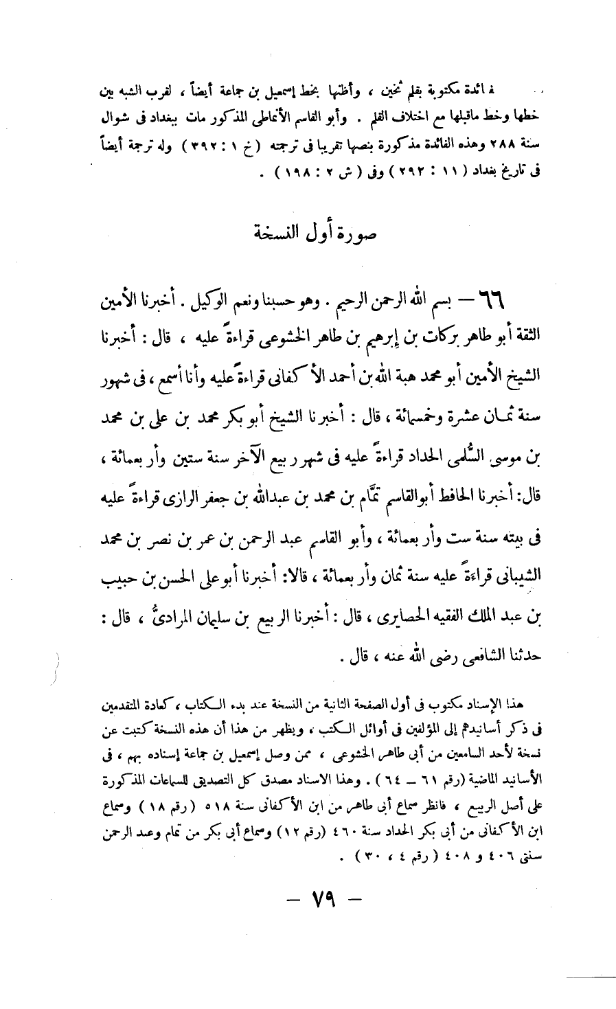 هذا الاسناد مكتوب في أول الصفحة الثانية من النسخة عند بدء الكتاب، كعادة المتقدمين في ذكر أسانيدهم إلى المؤلفين في أوائل الكتب، ويظهر من هذا أن هذه النسخة كتبت عن نسخة لاحد السامعين من أبي طاهر الخشوعي، ممن وصل إسمعيل بن جماعة إسناده بهم، في الاسانيد الماضية (رقم ٦١ - ٦٤) .