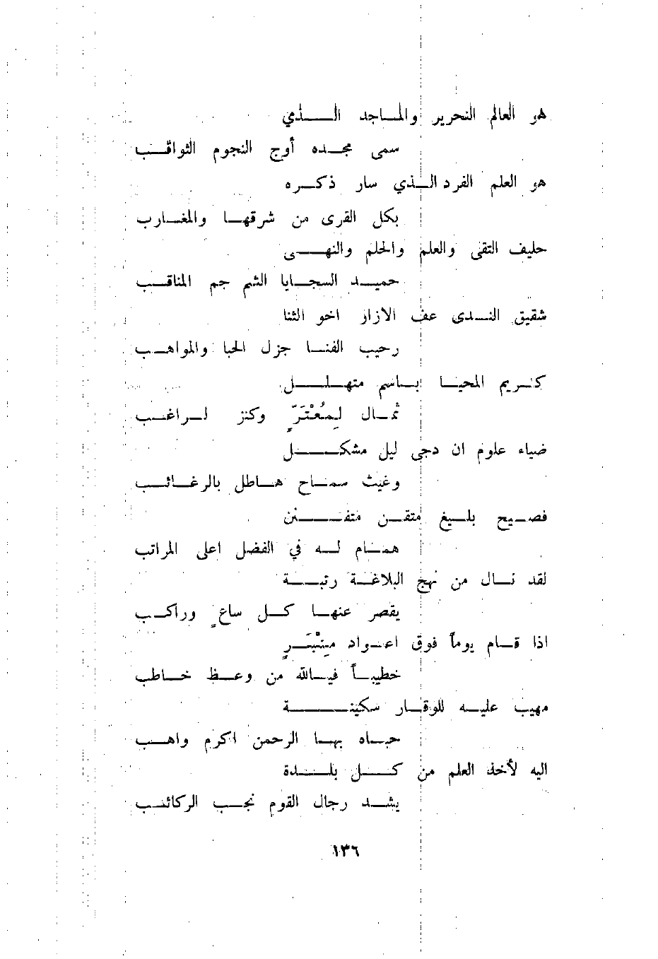 على عبارات الشارح وجمله بكلام يوضح المعنى ويزيح الإشكال، ويصور المسائل تصويرا ملموسا يقرب المعاني الفقهية إلي أذهان الطلبة ويقرر قواعدها في نفوسهم لأنه _ رحمه الله _ آخذ بناصية علم الفقه ومتبحرفيه تبحرا عظيما، فإذا انتهى من تقريره على الفقه شرعوا في القراءة عليه في بلوغ المرام، فإذا أشارت الساعة إلي الواحدة نهارا انصرف إلي داره وجلس فيها فإذا حانت الساعة الثالثة جاءه كبار الطلبة وخواصهم وقرأوا عليه إلي الساعة الخامسة نهارا ثم انصرفوا فإذا أذن الظهر خرج وصلى بالناس في المسجد وجاء أهل المطولات وقرأوا عليه في مختلف الكتب بجامع الترمذي وصحيح البخاري وزاد المعاد وهدي خير العباد، فإذا انتهوا قرأ عليه بعض الطلبة في بعض المتون العلمية غيبا مثل كتاب التوحيد والعقيدة الواسطية، فإذا أذن العصر خرج إلي داره وجدد الوضوء ثم رجع وصلى بالناس العصر وجلس في المسجد يقرأ عليه أحد أعيان الطلبة في بعض الردود، فإذا انتهى قرأ عليه جملة من الطلبة في مصطلح الحديث، فإذا انتهوا قرأوا عليه في العقيدة الحموية لشيخ الإسلام ابن تيمية، فإذا بقى على أذان المغرب مقدار نصف ساعة خرج إلي داره فإذا أذن المغرب جاء وصلى بالناس ثم جلس في المسجد للطلبة يقرأون عليه علم الفرائض المواريث، فإذا ختم أذان العشاء قام من حلقة درس الفرائض إلي الصف الأول وتنقل ثم أمر القارىء فشرع يقرأ عليه في تفسير ابن كثير إلي الساعة الثانية والنصف فيأمر بإقامة صلاة العشاء، فإذا أقيمت وصلى بالناس تنقل واوتر وخرج إلي داره وهي قريبة من مسجده واستمر على هذا الترتيب في الدروس بهذه الصفة من عام 1339هـ إلي عام 1380هـ حيث ترك جميع الدروس ما عدا درس الفقه وبلوغ المرام فانه لم يترك الجلوس لهما بعد صلاة الفجر إلي أن حبسه المرض.