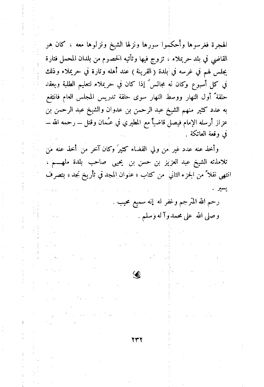 ثم أقيمت صلاة فإذا صلى العشاء ثم النافلة والوتر ذهب إلي دار عبد العزيز بن مشيقح للقهوة ودرس عليه هناك بعض الطلبة وعددهم نحو الخمسة عشر طالبا ثم ذهب إلي داره، فهذه طريقة دروسه وترتيبها مدة حياته. وكان إلي جانب ذلك يتعاطى أسباب البيع والشراء كالسلم في الثمار من الحنطة والتمر والتورق، فوسع الله عليه في الرزق.