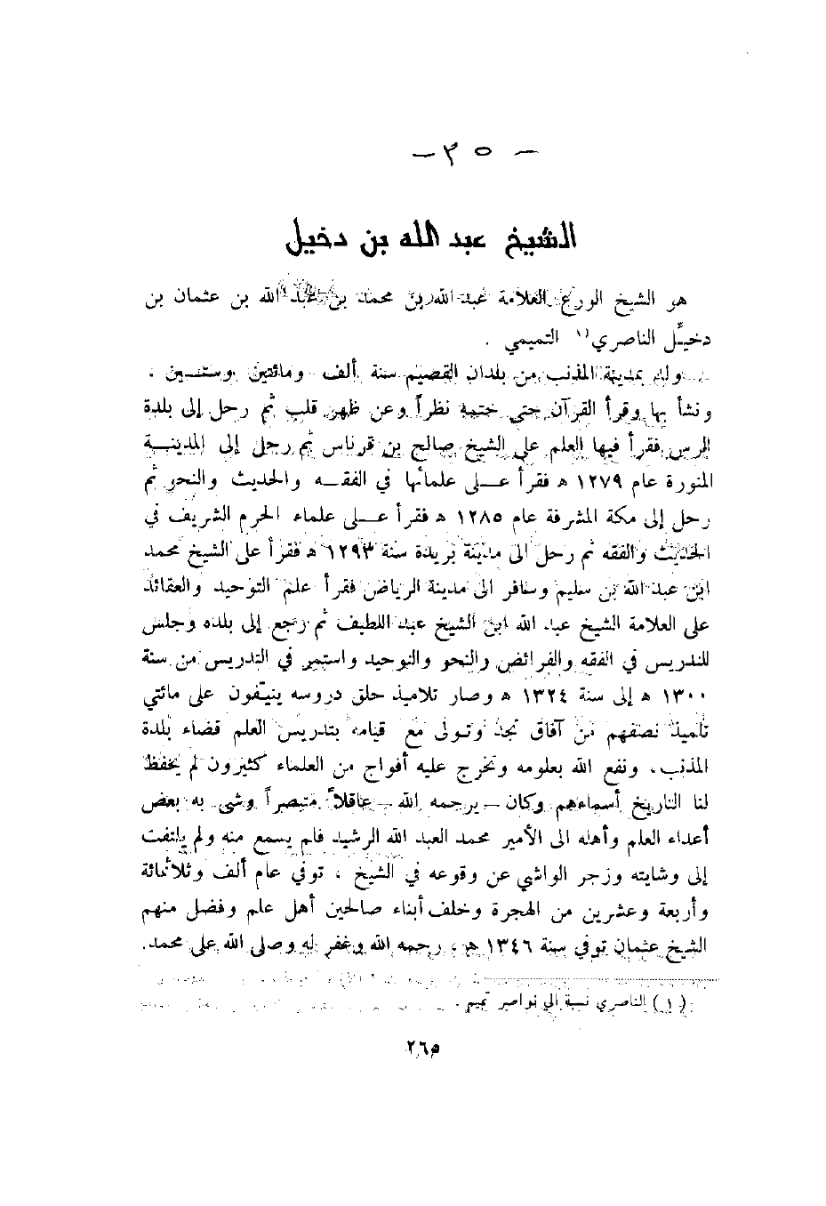 القرآن ويكتب العلم ويتعبد وكان يحج كل حتى مرض في آخر عمره ومع ذلك فقد كان سمح الأخلاق واسع البال لا يعرف الغضب إليه طريقا وكان لا يمل حديثه ولا مجالسته وكان يتفقد أقاربه وجيرانه ويتعهد الفقراء والمساكين حسب استطاعته، وكان صريحا في الحق لا يخشى في الله لومة لائم وكان محبوبا لدى عارفيه والمتصلين به. ألف رحمه الله _ "زوائد الزاد" في فقه إمام أهل السنة أحمد بن حنبل الشيباني يقع في 942صفحة من القطع الكبير بالمطبعة السلفية بمصر على نفقته وجعله وقفا لله على طلبة العلم. توفي – رحمه الله في يوم الجمعة ثالث عشر شهر شعبان سنة إحدى وثمانين وثلاثمائة وألف في بريدة وصلى عليه في المسجد الجامع الكبير ودفن في مدينة بريدة – رحمه الله _ وغفر له واسكنه فسيح جنته وصلى الله على محمد.