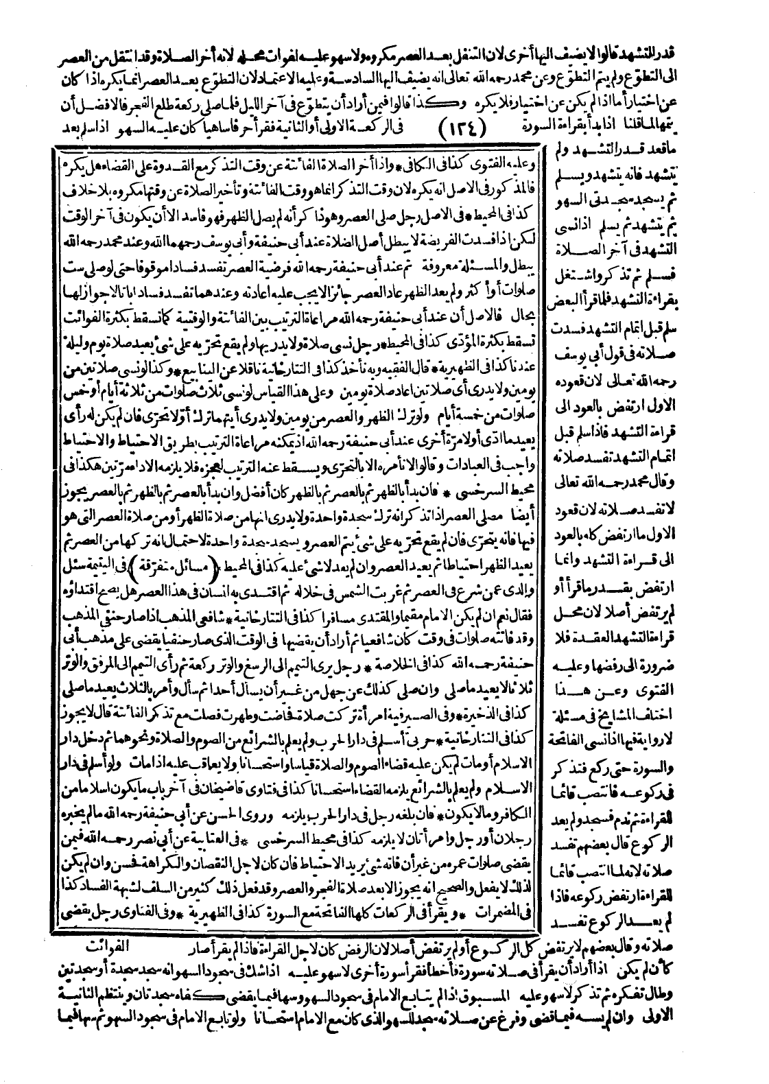 فِي الْأَصْلِ رَجُلٌ صَلَّى الْعَصْرَ وَهُوَ ذَاكِرٌ أَنَّهُ لَمْ يُصَلِّ الظُّهْرَ فَهُوَ فَاسِدٌ إلَّا أَنْ يَكُونَ فِي آخِرِ الْوَقْتِ لَكِنْ إذَا فَسَدَتْ الْفَرِيضَةُ لَا يَبْطُلُ أَصْلُ الصَّلَاةِ عِنْدَ أَبِي حَنِيفَةَ وَأَبِي يُوسُفَ - رَحِمَهُمَا اللَّهُ - وَعِنْدَ مُحَمَّدٍ - رَحِمَهُ اللَّهُ - يَبْطُلُ وَالْمَسْأَلَةُ مَعْرُوفَةٌ ثُمَّ عِنْدَ أَبِي حَنِيفَةَ - رَحِمَهُ اللَّهُ - فَرْضِيَّةُ الْعَصْرِ تَفْسُدُ فَسَادًا مَوْقُوفًا حَتَّى لَوْ صَلَّى سِتَّ صَلَوَاتٍ أَوْ أَكْثَرَ وَلَمْ يُعِدْ الظُّهْرَ عَادَ الْعَصْرَ جَائِزًا لَا يَجِبُ إعَادَتُهُ وَعِنْدَهُمَا تَفْسُدُ فَسَادًا بَاتًّا لَا جَوَازَ لَهَا بِحَالٍ فَالْأَصْلُ أَنَّ عِنْدَ أَبِي حَنِيفَةَ - رَحِمَهُ اللَّهُ - مُرَاعَاةُ التَّرْتِيبِ بَيْنَ الْفَائِتَةِ وَالْوَقْتِيَّةِ كَمَا تَسْقُطُ بِكَثْرَةِ الْفَوَائِتِ تَسْقُطُ بِكَثْرَةِ الْمُؤَدَّى، كَذَا فِي الْمُحِيطِ.