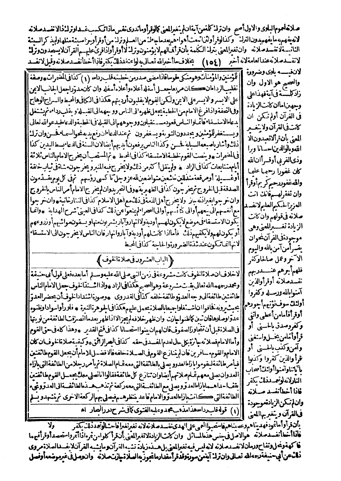 (الْبَابُ الْعِشْرُونَ فِي صَلَاةِ الْخَوْفِ) لَا خِلَافَ أَنَّ صَلَاةَ الْخَوْفِ كَانَتْ مَشْرُوعَةً فِي زَمَنِ النَّبِيِّ - صَلَّى اللَّهُ عَلَيْهِ وَسَلَّمَ - أَمَّا بَعْدَهُ فَعَلَى قَوْلِ أَبِي حَنِيفَةَ وَمُحَمَّدٍ - رَحِمَهُمَا اللَّهُ تَعَالَى - بَقِيَتْ مَشْرُوعَةً وَهُوَ الصَّحِيحُ، هَكَذَا فِي الزَّادِ وَإِذَا اشْتَدَّ الْخَوْفُ جَعَلَ الْإِمَامُ النَّاسَ طَائِفَتَيْنِ طَائِفَةً إلَى وَجْهِ الْعَدُوِّ وَطَائِفَةً خَلْفَهُ، كَذَا فِي الْقُدُورِيِّ.