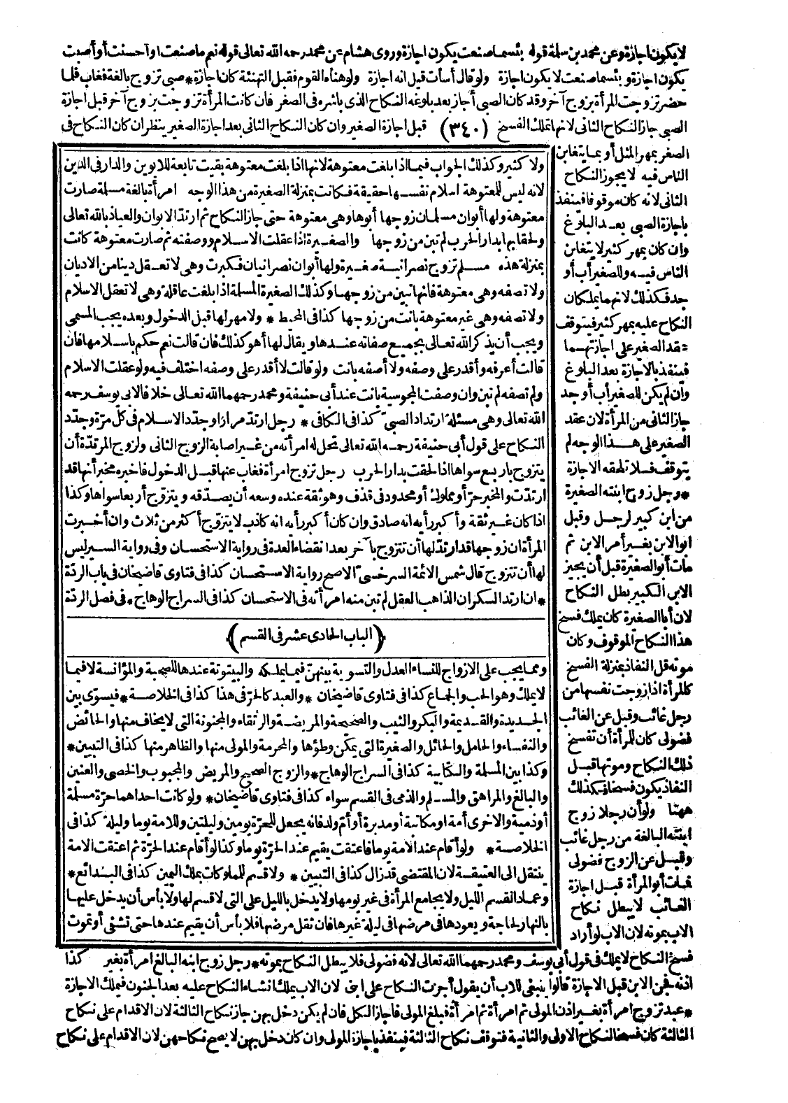 (الْبَابُ الْحَادِيَ عَشَرَ فِي الْقَسْمِ) وَمِمَّا يَجِبُ عَلَى الْأَزْوَاجِ لِلنِّسَاءِ الْعَدْلُ وَالتَّسْوِيَةُ بَيْنَهُنَّ فِيمَا يَمْلِكُهُ وَالْبَيْتُوتَةُ عِنْدَهَا لِلصُّحْبَةِ وَالْمُؤَانَسَةِ لَا فِيمَا لَا يَمْلِكُ وَهُوَ الْحُبُّ وَالْجِمَاعُ كَذَا فِي فَتَاوَى قَاضِي خَانْ. وَالْعَبْدُ كَالْحُرِّ فِي هَذَا كَذَا فِي الْخُلَاصَةِ. فَيُسَوِّي بَيْنَ الْجَدِيدَةِ وَالْقَدِيمَةِ وَالْبِكْرِ وَالثَّيِّبِ وَالصَّحِيحَةِ وَالْمَرِيضَةِ وَالرَّتْقَاءِ وَالْمَجْنُونَةِ الَّتِي لَا يُخَافُ مِنْهَا وَالْحَائِضِ وَالنُّفَسَاءِ وَالْحَامِلِ وَالْحَائِلِ وَالصَّغِيرَةِ الَّتِي يُمْكِنُ وَطْؤُهَا وَالْمُحْرِمَةِ وَالْمَوْلَى مِنْهَا وَالْمُظَاهِرِ مِنْهَا كَذَا فِي التَّبْيِينِ. وَكَذَا بَيْنَ الْمُسْلِمَةِ وَالْكِتَابِيَّةِ كَذَا فِي السِّرَاجِ الْوَهَّاجِ. وَالزَّوْجُ الصَّحِيحُ وَالْمَرِيضُ وَالْمَجْبُوبُ وَالْخَصِيُّ وَالْعِنِّينُ وَالْبَالِغُ وَالْمُرَاهِقُ وَالْمُسْلِمُ وَالذِّمِّيُّ فِي الْقَسْمِ سَوَاءٌ كَذَا فِي فَتَاوَى قَاضِي خَانْ.