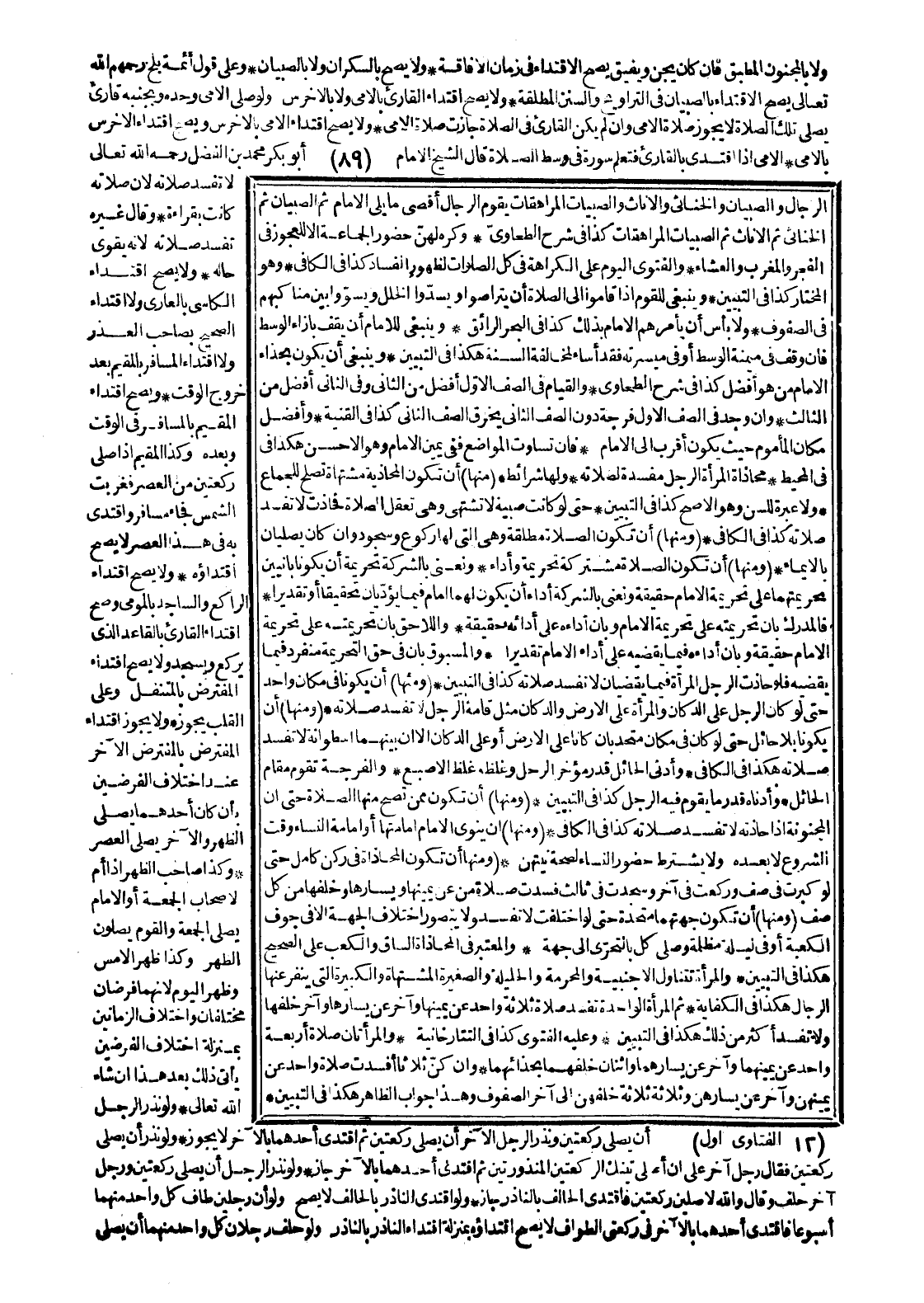 وَعَلَيْهِ الْفَتْوَى. كَذَا فِي التَّتَارْخَانِيَّة وَالْمَرْأَتَانِ صَلَاةَ أَرْبَعَةٍ وَاحِدٌ عَنْ يَمِينِهِمَا وَآخَرُ عَنْ يَسَارِهِمَا وَاثْنَانِ خَلْفَهُمَا بِحِذَائِهِمَا وَإِنْ كُنَّ ثَلَاثًا أَفْسَدَتْ صَلَاةَ وَاحِدٍ عَنْ يَمِينِهِنَّ وَآخَرَ عَنْ يَسَارِهِنَّ وَثَلَاثَةً خَلْفَهُنَّ إلَى آخِرِ الصُّفُوفِ وَهَذَا جَوَابُ الظَّاهِرِ. هَكَذَا فِي التَّبْيِينِ