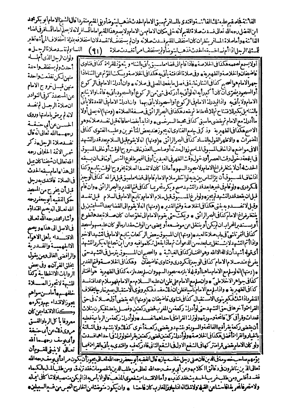 (وَمِنْهَا) أَنَّهُ يَقُومُ قَبْلَ السَّلَامِ بَعْدَ قَدْرِ التَّشَهُّدِ إلَّا فِي مَوَاضِعَ إذَا خَافَ الْمَسْبُوقُ الْمَاسِحُ زَوَالَ مُدَّتِهِ أَوْ صَاحِبُ الْعُذْرِ خَافَ خُرُوجَ الْوَقْتِ أَوْ خَافَ الْمَسْبُوقُ فِي الْجُمُعَةِ دُخُولَ وَقْتِ الْعَصْرِ أَوْ دُخُولَ وَقْتِ الظُّهْرِ فِي الْعِيدَيْنِ أَوْ فِي الْفَجْرِ طُلُوعَ الشَّمْسِ أَوْ خَافَ أَنْ يَسْبِقَهُ الْحَدَثُ لَهُ أَنْ يَنْتَظِرَ فَرَاغَ الْإِمَامِ وَلَا سُجُودَ السَّهْوِ أَمَّا إذَا كَانَ لَا تَفْسُدُ الصَّلَاةُ بِخُرُوجِ الْوَقْتِ يُتَابِعُ وَكَذَا إذَا خَافَ الْمَسْبُوقُ أَنْ يَمُرَّ النَّاسُ بَيْنَ يَدَيْهِ لَوْ انْتَظَرَ سَلَامَ الْإِمَامِ قَامَ إلَى قَضَاءِ مَا سَبَقَ قَبْلَ فَرَاغِهِ. كَذَا فِي الْوَجِيزِ لِلْكَرْدَرِيِّ وَلَوْ قَامَ فِي غَيْرِهَا بَعْدَ قَدْرِ التَّشَهُّدِ صَحَّ وَيُكْرَهُ تَحْرِيمًا كَذَا فِي فَتْحِ الْقَدِيرِ وَالْبَحْرِ الرَّائِقِ وَإِنْ قَامَ قَبْلَ أَنْ يَقْعُدَ قَدْرَ التَّشَهُّدِ لَمْ يَجُزْ.
