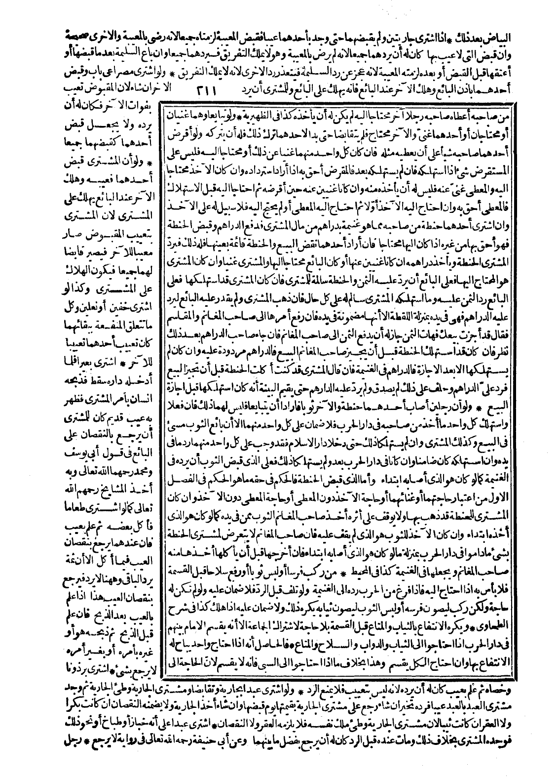 وَلَوْ تَبَايَعَا، وَهُمَا غَنِيَّانِ أَوْ مُحْتَاجَانِ أَوْ أَحَدُهُمَا غَنِيٌّ وَالْآخَرُ مُحْتَاجٌ، فَلَمْ يَتَقَابَضَا حَتَّى بَدَا لِأَحَدِهِمَا تَرْكُ ذَلِكَ، فَلَهُ أَنْ يَتْرُكَهُ وَلَوْ أَقْرَضَ أَحَدُهُمَا صَاحِبَهُ شَيْئًا عَلَى أَنْ يُعْطِيَهُ مِثْلَهُ، فَإِنْ كَانَ كُلُّ وَاحِدٍ مِنْهُمَا غَنِيًّا عَنْ ذَلِكَ أَوْ مُحْتَاجًا إلَيْهِ، فَلَيْسَ عَلَى الْمُسْتَقْرِضِ شَيْءٌ إذَا اسْتَهْلَكَهُ، فَإِنْ لَمْ يَسْتَهْلِكْهُ بَعْدُ، فَالْمُقْرِضُ أَحَقُّ بِهِ إذَا أَرَادَ اسْتِرْدَادَهُ، وَإِنْ كَانَ الْآخِذُ مُحْتَاجًا إلَيْهِ وَالْمُعْطِي غَنِيٌّ عَنْهُ، فَلَيْسَ لَهُ أَنْ يَأْخُذَهُ مِنْهُ، وَإِنْ كَانَا غَنِيَّيْنِ عَنْهُ حِينَ أَقْرَضَهُ، ثُمَّ احْتَاجَا إلَيْهِ قَبْلَ الِاسْتِهْلَاكِ، فَالْمُعْطِي أَحَقُّ بِهِ، وَإِنْ احْتَاجَ إلَيْهِ الْآخِذُ أَوَّلًا، ثُمَّ احْتَاجَ إلَيْهِ الْمُعْطِي أَوْ لَمْ يَحْتَجْ إلَيْهِ، فَلَا سَبِيلَ لَهُ عَلَى الْآخِذِ، وَإِنْ اشْتَرَى أَحَدُهُمَا حِنْطَةً مِنْ صَاحِبِهِ مِمَّا هُوَ غَنِيمَةٌ بِدَرَاهِمَ مِنْ مَالِ الْمُشْتَرِي فَدَفَعَ الدَّرَاهِمَ، وَقَبَضَ الْحِنْطَةَ فَهُوَ أَحَقُّ بِهَا مِنْ غَيْرِهِ إذَا كَانَ إلَيْهَا مُحْتَاجًا، فَإِنْ أَرَادَ أَحَدُهُمَا نَقْضَ الْبَيْعِ وَالْحِنْطَةُ قَائِمَةٌ بِعَيْنِهَا فَلَهُ ذَلِكَ، فَيَرُدُّ الْمُشْتَرِي الْحِنْطَةَ، وَيَأْخُذُ دَرَاهِمَهُ إنْ كَانَا غَنِيَّيْنِ عَنْهَا، أَوْ كَانَ الْبَائِعُ مُحْتَاجًا إلَيْهَا وَالْمُشْتَرِي غَنِيًّا، وَإِنْ كَانَ الْمُشْتَرِي هُوَ الْمُحْتَاجُ إلَيْهَا، فَعَلَى الْبَائِعِ أَنْ يَرُدَّ عَلَيْهِ الثَّمَنَ وَالْحِنْطَةَ سَالِمَةً لِلْمُشْتَرِي، فَإِنْ كَانَ الْمُشْتَرِي قَدْ اسْتَهْلَكَهَا فَعَلَى الْبَائِعِ رَدُّ الثَّمَنِ عَلَيْهِ، وَمَا اسْتَهْلَكَهُ الْمُشْتَرِي سَالِمٌ لَهُ عَلَى كُلِّ حَالٍ، فَإِنْ ذَهَبَ الْمُشْتَرِي، وَلَمْ يَقْدِرْ عَلَيْهِ الْبَائِعُ لِيَرُدَّ عَلَيْهِ الدَّرَاهِمَ، فَهِيَ فِي يَدِهِ بِمَنْزِلَةِ اللُّقَطَةِ إلَّا أَنَّهَا مَضْمُونَةٌ فِي يَدِهِ.