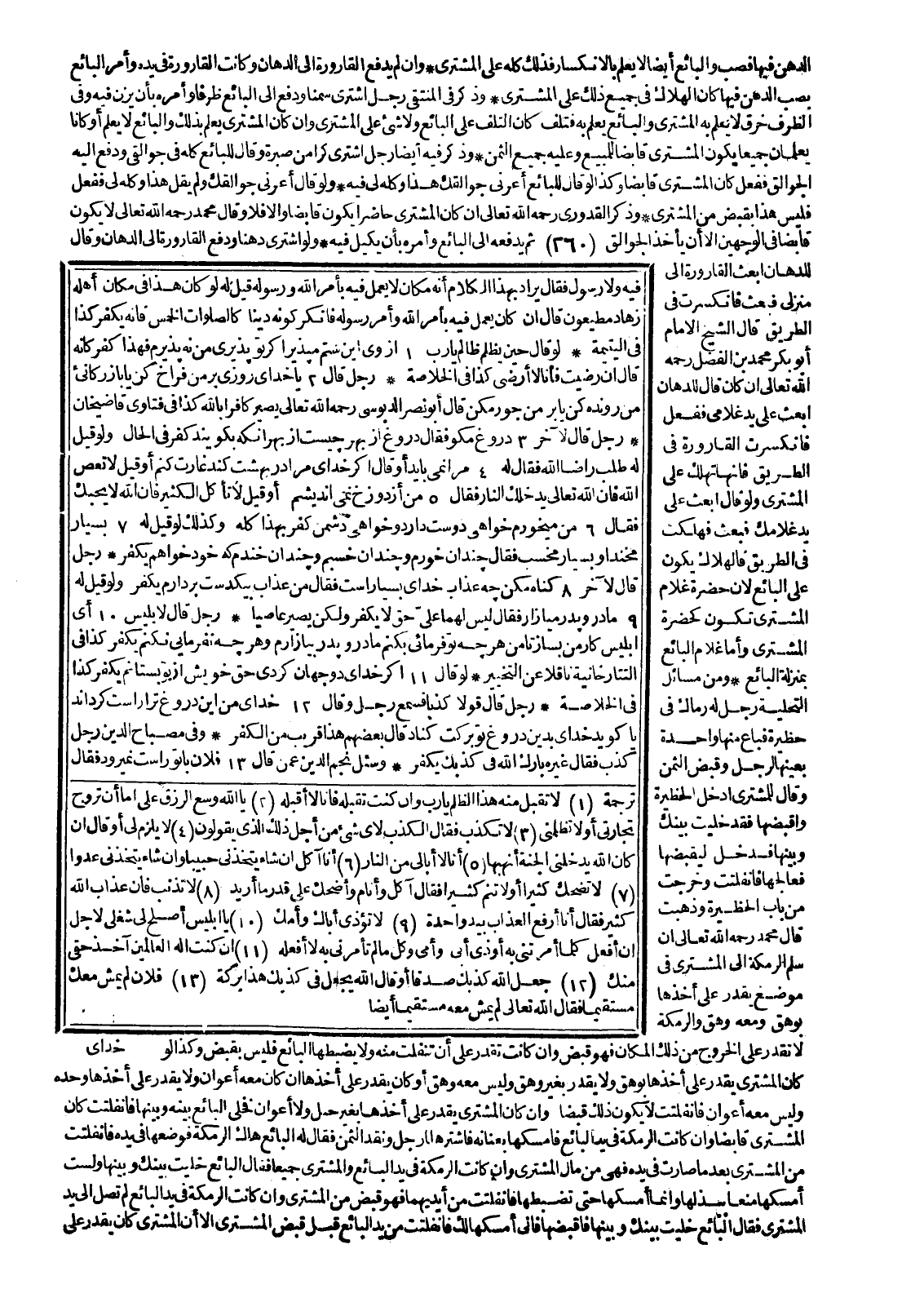 رَجُلٌ قَالَ لِآخَرَ: دروغ مُكَوٍّ فَقَالَ: دروغ ازبهر جيست ازبهر انْكِهِ بكويند كَفَرَ فِي الْحَالِ، وَلَوْ قِيلَ لَهُ اُطْلُبْ رِضَا اللَّهِ فَقَالَ لَهُ: مرانمي بايد، أَوْ قَالَ: اكراخداي مُرَاد ربهشت كندغارت كنم، أَوْ قِيلَ لَا تَعْصِ اللَّهَ فَإِنَّ اللَّهَ تَعَالَى يُدْخِلُكَ النَّارَ فَقَالَ: مِنْ أزدوزخ نُمَيٍّ انديشم، أَوْ قِيلَ لَا تَأْكُلْ الْكَثِيرَ فَإِنَّ اللَّهَ لَا يُحِبُّكَ فَقَالَ: مِنْ ميخورم خواهي دوست دارد وخواهي دشمن كَفَرَ بِهَذَا كُلِّهِ، وَكَذَلِكَ لَوْ قِيلَ لَهُ: بِسَيَّارِ مخندا وَبِسَيَّارِ مخسب فَقَالَ: جندان خورم وجندان خسبم وجندان خندم كه خَوْد خَوَاهُمْ يَكْفُرُ.