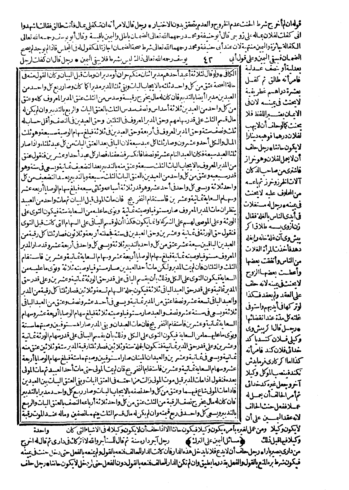 لَوْ قَالَ لِثَلَاثَةِ أَعْبُدٍ أَحَدُهُمْ مُدَبَّرٌ: اثْنَانِ مِنْكُمْ حُرَّانِ أَوْ مُدَبَّرَانِ وَمَاتَ قَبْلَ الْبَيَانِ وَكَانَ الْقَوْلُ مِنْهُ فِي حَالَةِ الصِّحَّةِ عَتَقَ مِنْ كُلِّ وَاحِدٍ ثُلُثُهُ بِالْإِيجَابِ الْبَاتِّ وَبَقِيَ ثُلُثَا الْمُدَبَّرِ مُدَبَّرًا كَمَا كَانَ وَصَارَ رُبْعُ كُلِّ وَاحِدٍ مِنْ الْعَبْدَيْنِ مُدَبَّرًا أَيْضًا بِالتَّدْبِيرِ فَإِنْ كَانَ لَهُ مَالٌ يَخْرُجُ رَقَبَةٌ وَسُدُسٌ مِنْ الثُّلُثِ عَتَقَ الْمُدَبَّرُ الْمَعْرُوفُ كُلُّهُ وَعَتَقَ مِنْ كُلِّ وَاحِدٍ مِنْ الْعَبْدَيْنِ ثَلَاثَةُ أَسْدَاسٍ وَنِصْفُ سُدُسِ الثُّلُثِ بِالْعِتْقِ الْبَاتِّ وَالرُّبْعُ بِالتَّدْبِيرِ، وَإِنْ لَمْ يَكُنْ لَهُ مَالٌ قُسِّمَ الثُّلُثُ عَلَى قَدْرِ سِهَامِهِمْ وَحَقُّ الْمُدَبَّرِ الْمَعْرُوفِ فِي الثُّلُثَيْنِ وَحَقُّ الْعَبْدَيْنِ فِي النِّصْفِ وَأَقَلُّ حِسَابٍ لَهُ ثُلُثٌ وَنِصْفٌ سِتَّةٌ، وَحَقُّ الْمُدَبَّرِ الْمَعْرُوفِ فِي أَرْبَعَةٍ وَحَقُّ الْعَبْدَيْنِ فِي ثَلَاثَةٍ فَبَلَغَ سِهَامُ الْوَصِيَّةِ سَبْعَةً وَهُوَ ثُلُثُ الْمَالِ وَالْكُلُّ أَحَدٌ وَعِشْرُونَ، وَصَارَ ثُلُثَا كُلِّ عَبْدٍ سَبْعَةً؛ لِأَنَّ الْبَاقِيَ بَعْدَ الْعِتْقِ الْبَاتِّ مِنْ كُلِّ عَبْدٍ ثُلُثَاهُ وَإِذَا صَارَ ثُلُثَا الْعَبْدِ سَبْعَةً فَكَانَ الْعَبْدُ التَّامُّ عَشَرَةً وَنِصْفًا فَانْكَسَرَ فَضَعَّفْنَاهُ فَصَارَ كُلُّ عَبْدٍ أَحَدًا وَعِشْرِينَ فَنَقُولُ: عَتَقَ مِنْ الْمُدَبَّرِ الْمَعْرُوفِ بِالْإِيجَابِ الْبَاتِّ الثُّلُثُ سَبْعَةٌ وَعَتَقَ مِنْهُ بِالتَّدْبِيرِ بَعْدَ التَّضْعِيفِ ثَمَانِيَةٌ وَيَسْعَى فِي سِتَّةٍ وَهُوَ قَدْرُ سُبْعَيْهِ، وَعَتَقَ مِنْ كُلِّ وَاحِدٍ مِنْ الْعَبْدَيْنِ بِالْعِتْقِ الْبَاتِّ الثُّلُثُ وَبِالتَّدْبِيرِ بَعْدَ التَّضْعِيفِ مِنْ كُلِّ وَاحِدٍ ثَلَاثَةٌ، وَيَسْعَى كُلُّ وَاحِدٍ فِي أَحَدَ عَشَرَ وَهُوَ قَدْرُ ثَلَاثَةِ أَسْبَاعِهِ وَثُلُثَيْ سُبْعِهِ فَبَلَغَ سِهَامُ الْوَصَايَا أَرْبَعَةَ عَشَرَ، وَسِهَامُ السِّعَايَةِ ثَمَانِيَةً وَعِشْرِينَ فَاسْتَقَامَ التَّخْرِيجُ فَإِنْ مَاتَ الْمَوْلَى قَبْلَ الْبَيَانِ، ثُمَّ مَاتَ وَاحِدٌ مِنْ الْعَبِيدِ يُنْظَرُ إنْ مَاتَ الْمُدَبَّرُ الْمَعْرُوفُ صَارَ مُسْتَوْفِيًا وَصِيَّتَهُ ثَمَانِيَةً وَتَوَى مَا عَلَيْهِ مِنْ السِّعَايَةِ سِتَّةً فَيَكُونُ التَّوَى عَلَى الْوَرَثَةِ، وَعَلَى الْمُوصَى لَهُمْ عَلَى الشَّرِكَةِ وَإِنَّمَا يَكُونُ هَكَذَا أَنْ لَوْ قُسِّمَ الْبَاقِي عَلَى السِّهَامِ الَّتِي كَانَتْ قَبْلَ التَّوَى فَنَقُولُ: حَقُّ الْوَرَثَةِ فِي ثَمَانِيَةٍ وَعِشْرِينَ وَحَقُّ الْعَبْدَيْنِ فِي سِتَّةٍ فَجُمْلَتُهُ أَرْبَعَةٌ وَثَلَاثُونَ فَصَارَ ثُلُثَا كُلِّ رَقَبَةٍ مِنْ الْعَبْدَيْنِ الْبَاقِيَيْنِ سَبْعَةَ عَشَرَ عَتَقَ مِنْ كُلِّ وَاحِدٍ بِالتَّدْبِيرِ ثَلَاثَةٌ.