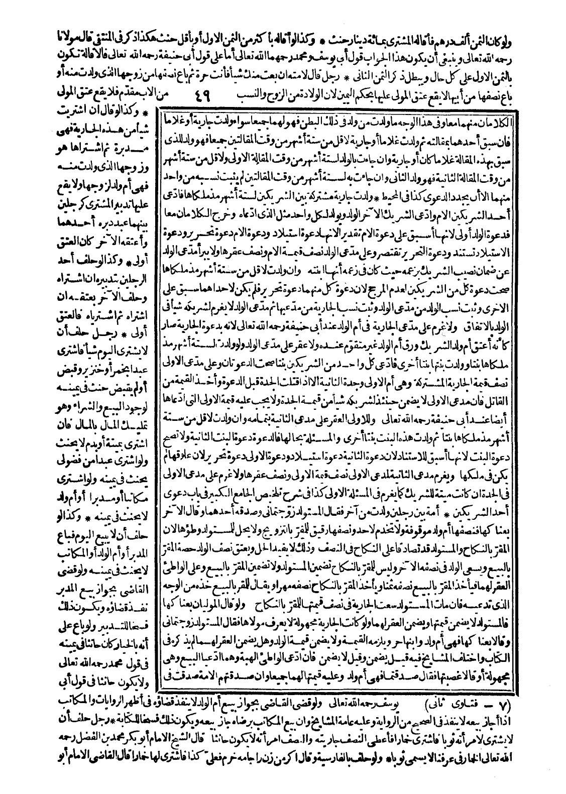 أَمَةٌ بَيْنَ رَجُلَيْنِ وَلَدَتْ مِنْ آخَرَ، فَقَالَ الْمُسْتَوْلَدُ زَوَّجْتُمَانِي، وَصَدَّقَهُ أَحَدُهُمَا وَقَالَ: الْآخَرُ بِعْنَاكَهَا فَنِصْفُهَا أُمُّ وَلَدٍ مَوْقُوفَةٌ وَلَا تَخْدُمُ لِأَحَدٍ وَنِصْفُهَا رَقِيقٌ لِلْمُقِرِّ بِالتَّزْوِيجِ وَلَا يَحِلُّ لِلْمُسْتَوْلِدِ وَطْؤُهَا لِأَنَّ الْمُقِرَّ بِالنِّكَاحِ وَالْمُسْتَوْلِدَ قَدْ تَصَادَقَا عَلَى النِّكَاحِ فِي النِّصْفِ وَذَلِكَ لَا يُفِيدُ الْحِلَّ وَيُعْتَقُ نِصْفُ الْوَلَدِ حِصَّةَ الْمُقِرِّ بِالْبَيْعِ وَيَسْعَى الْوَلَدُ فِي نِصْفِهِ الْآخَرِ وَلَيْسَ لِلْمُقِرِّ بِالنِّكَاحِ تَضْمِينُ الْمُسْتَوْلَدِ وَلَا تَضْمِينُ الْمُقِرِّ بِالْبَيْعِ وَعَلَى الْوَاطِئِ الْعُقْرُ لَهُمَا فَيَأْخُذُ الْمُقِرُّ بِالْبَيْعِ نِصْفَهُ ثَمَنًا وَيَأْخُذُ الْمُقِرُّ بِالنِّكَاحِ نِصْفَهُ مَهْرًا وَيُقَالُ لِلْمُقِرِّ بِالْبَيْعِ: خُذْهُ مِنْ الْوَجْهِ الَّذِي تَدَّعِيهِ فَإِنْ مَاتَ الْمُسْتَوْلِدُ سَعَتْ الْجَارِيَةُ فِي نِصْفِ قِيمَتِهَا لِلْمُقِرِّ بِالنِّكَاحِ وَلَوْ قَالَ الْمَوْلَيَانِ بِعْنَاكَهَا فَالْمُسْتَوْلَدُ لَا يَضْمَنُ قِيمَتَهَا وَيَضْمَنُ الْعُقْرَ لَهُمَا وَلَوْ كَانَتْ الْجَارِيَةُ مَجْهُولَةً لَا يُعْرَفُ مَوْلَاهَا، فَقَالَ الْمُسْتَوْلَدُ زَوَّجْتُمَانِي، وَقَالَا بِعْنَاكَهَا فَهِيَ أُمُّ وَلَدٍ وَابْنُهَا حُرٌّ وَيَلْزَمُهُ الْقِيمَةُ وَلَا يَضْمَنُ قِيمَةَ الْوَلَدِ وَهَلْ يَضْمَنُ الْعُقْرَ لَهُمَا لَمْ يَذْكُرْهُ فِي الْكِتَابِ وَاخْتَلَفَ الْمَشَايِخُ فِيهِ قِيلَ: يَضْمَنُ وَقِيلَ: لَا يَضْمَنُ فَإِنْ ادَّعَى الْوَاطِئُ الْهِبَةَ، وَهُمَا ادَّعَيَا الْبَيْعَ، وَهِيَ مَجْهُولَةٌ أَوْ قَالَا غَصَبْتُهَا، فَقَالَ صَدَقْتُمَا فَهِيَ أُمُّ وَلَدٍ وَعَلَيْهِ قِيمَتُهَا لَهُمَا جَمِيعًا، وَإِنْ صَدَّقَتْهُمْ الْأَمَةُ صُدِّقَتْ فِي