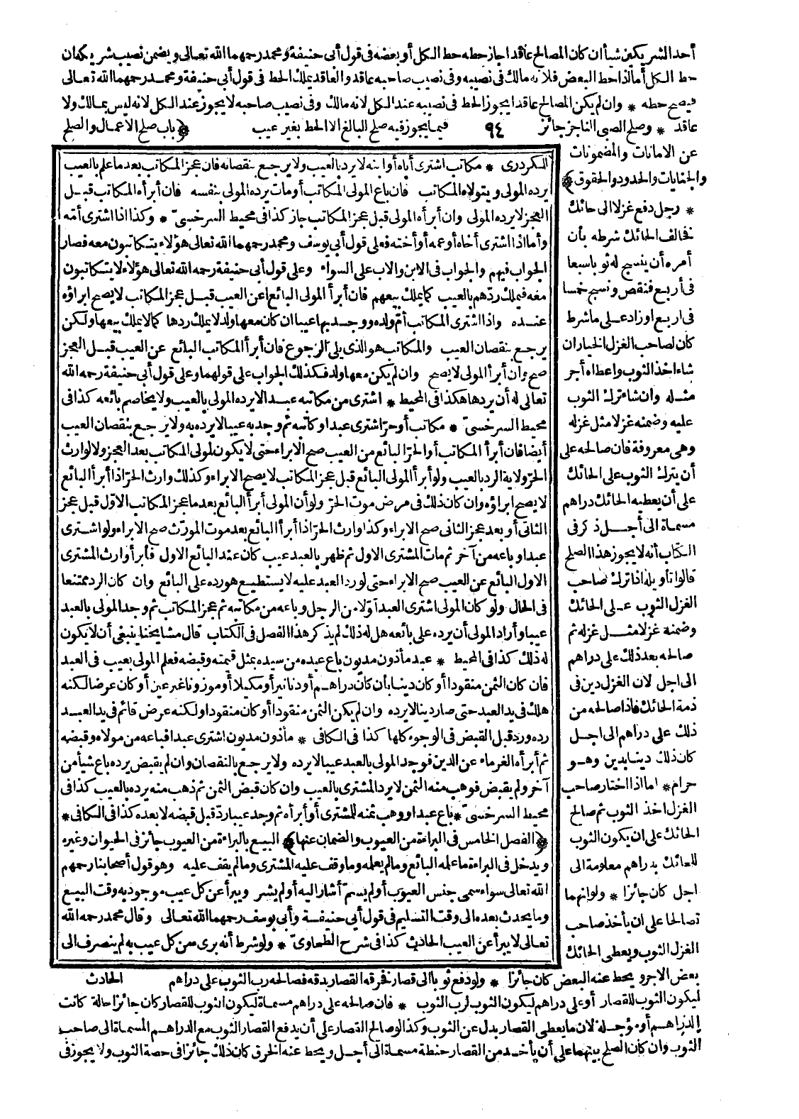 عَبْدٌ مَأْذُونٌ مَدْيُونٌ بَاعَ عَبْدَهُ مِنْ سَيِّدِهِ بِمِثْلِ قِيمَتِهِ وَقَبَضَهُ فَعَلِمَ الْمَوْلَى بِعَيْبٍ فِي الْعَبْدِ فَإِنْ كَانَ الثَّمَنُ مَنْقُودًا أَوْ كَانَ دَيْنًا بِأَنْ كَانَ دَرَاهِمَ أَوْ دَنَانِيرَ أَوْ مَكِيلًا أَوْ مَوْزُونًا غَيْرَ عَيْنٍ أَوْ كَانَ عَرَضًا لَكِنَّهُ هَلَكَ فِي يَدِ الْعَبْدِ حَتَّى صَارَ دَيْنًا لَا يَرُدُّهُ، وَإِنْ لَمْ يَكُنْ الثَّمَنُ مَنْقُودًا أَوْ كَانَ مَنْقُودًا وَلَكِنَّهُ عَرَضٌ قَائِمٌ فِي يَدِ الْعَبْدِ رَدَّهُ وَرَدَّ قَبْلَ الْقَبْضِ فِي الْوُجُوهِ كُلِّهَا كَذَا فِي الْكَافِي. مَأْذُونٌ مَدْيُونٌ اشْتَرَى عَبْدًا فَبَاعَهُ مِنْ مَوْلَاهُ وَقَبَضَهُ ثُمَّ أَبْرَأهُ الْغُرَمَاءُ عَنْ الدَّيْنِ فَوَجَدَ الْمَوْلَى بِالْعَبْدِ عَيْبًا لَا يَرُدُّهُ وَلَا يَرْجِعُ بِالنُّقْصَانِ وَإِنْ لَمْ يَقْبِضْ يَرُدُّهُ.