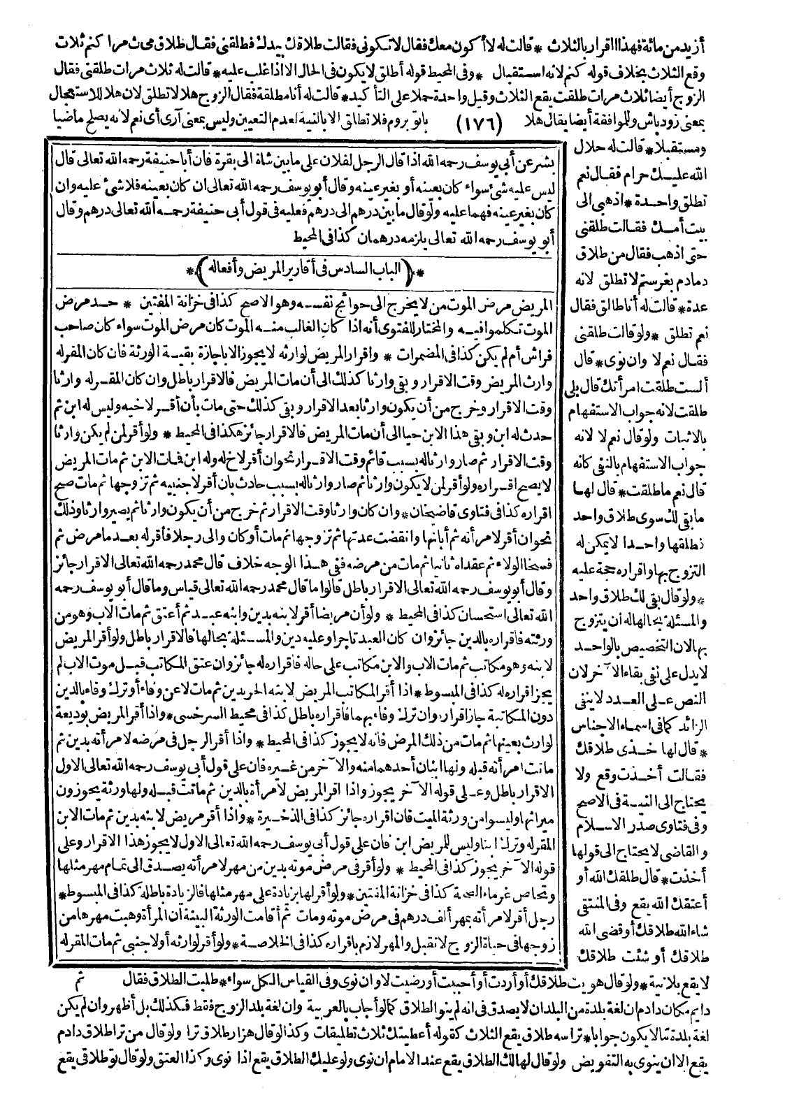 (الْبَابُ السَّادِسُ فِي أَقَارِيرِ الْمَرِيضِ وَأَفْعَالِهِ) الْمَرِيضُ مَرَضَ الْمَوْتِ مَنْ لَا يَخْرُجُ إلَى حَوَائِجِ نَفْسِهِ وَهُوَ الْأَصَحُّ كَذَا فِي خِزَانَةِ الْمُفْتِينَ حَدُّ مَرَضِ الْمَوْتِ تَكَلَّمُوا فِيهِ وَالْمُخْتَارُ لِلْفَتْوَى أَنَّهُ إذَا كَانَ الْغَالِبُ مِنْهُ الْمَوْتَ كَانَ مَرَضَ الْمَوْتِ سَوَاءٌ كَانَ صَاحِبَ فِرَاشٍ أَمْ لَمْ يَكُنْ كَذَا فِي الْمُضْمَرَاتِ.