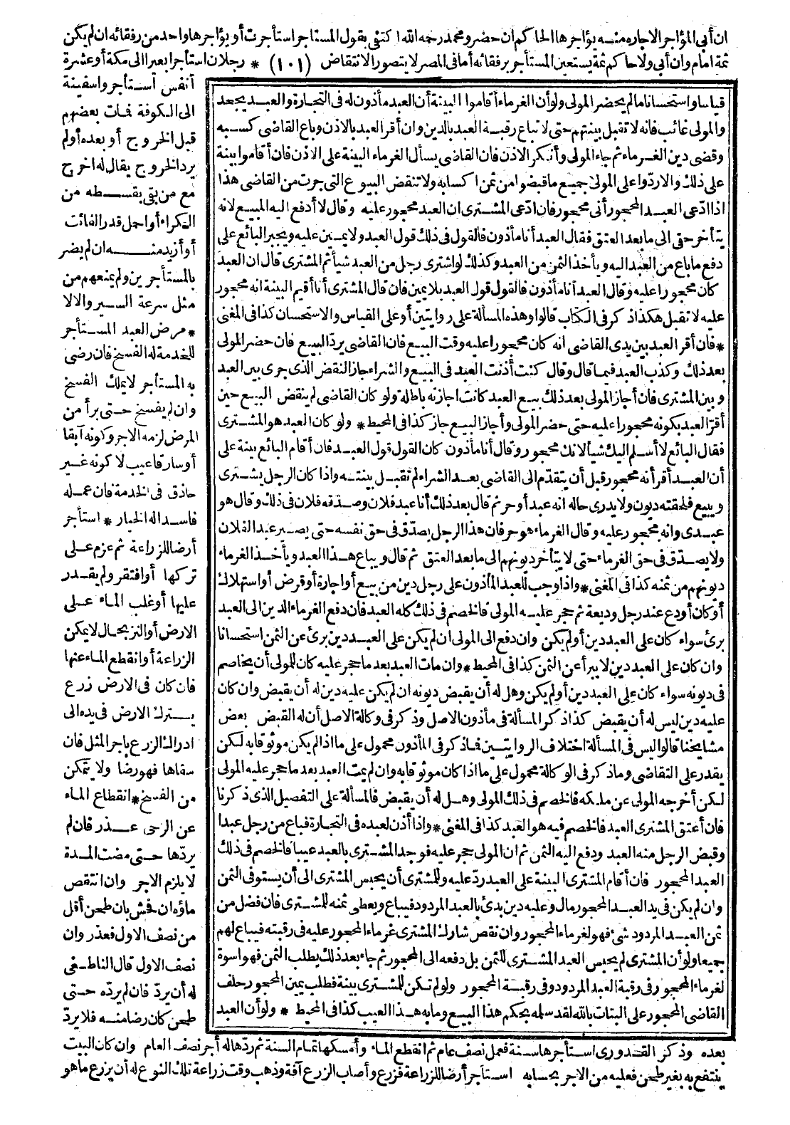 وَإِذَا أَذِنَ لِعَبْدِهِ فِي التِّجَارَةِ فَبَاعَ مِنْ رَجُلٍ عَبْدًا، وَقَبَضَ الرَّجُلُ مِنْهُ الْعَبْدَ، وَدَفَعَ إلَيْهِ الثَّمَنَ ثُمَّ إنَّ الْمَوْلَى حَجَرَ عَلَيْهِ فَوَجَدَ الْمُشْتَرِي بِالْعَبْدِ عَيْبًا فَالْخَصْمُ فِي ذَلِكَ الْعَبْدُ الْمَحْجُورُ فَإِنْ أَقَامَ الْمُشْتَرِي الْبَيِّنَةَ عَلَى الْعَبْدِ رُدَّ عَلَيْهِ، وَلِلْمُشْتَرِي أَنْ يَحْبِسَ الْمُشْتَرِي إلَى أَنْ يَسْتَوْفِيَ الثَّمَنَ، وَإِنْ لَمْ يَكُنْ فِي يَدِ الْعَبْدِ الْمَحْجُورِ مَالٌ، وَعَلَيْهِ دَيْنٌ بُدِئَ بِالْعَبْدِ الْمَرْدُودِ فَيُبَاعُ وَيُعْطَى ثَمَنُهُ لِلْمُشْتَرِي فَإِنْ فَضَلَ مِنْ ثَمَنِ الْعَبْدِ الْمَرْدُودِ شَيْءٌ فَهُوَ لِغُرَمَاءِ الْمَحْجُورِ، وَإِنْ نَقَصَ شَارَكَ الْمُشْتَرِي غُرَمَاءَ الْمَحْجُورِ عَلَيْهِ فِي رَقَبَتِهِ فَيُبَاعُ لَهُمْ جَمِيعًا، وَلَوْ أَنَّ الْمُشْتَرِي لَمْ يَحْبِسْ الْعَبْدَ الْمُشْتَرِي لِلثَّمَنِ بَلْ دَفَعَهُ إلَى الْمَحْجُورِ ثُمَّ جَاءَ بَعْدَ ذَلِكَ يَطْلُبُ الثَّمَنَ فَهُوَ أُسْوَةٌ لِغُرَمَاءِ الْمَحْجُورِ فِي رَقَبَةِ الْعَبْدِ الْمَرْدُودِ، وَفِي رَقَبَةِ الْمَحْجُورِ، وَلَوْ لَمْ تَكُنْ لِلْمُشْتَرِي بَيِّنَةٌ فَطَلَبَ يَمِينَ الْمَحْجُورِ حَلَّفَ الْقَاضِي الْمَحْجُورَ عَلَى الْبَتَاتِ بِاَللَّهِ لَقَدْ سَلَّمَهُ بِحُكْمِ هَذَا الْبَيْعِ، وَمَا بِهِ هَذَا الْعَيْبُ كَذَا فِي الْمُحِيطِ، وَلَوْ أَنَّ الْعَبْدَ