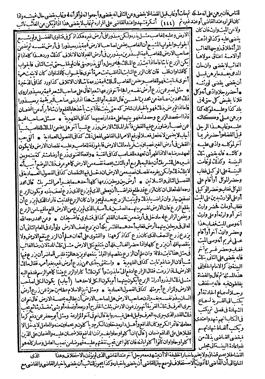 وَسُئِلَ شَيْخُ الْإِسْلَامِ عَطَاءُ بْنُ حَمْزَةَ عَمَّنْ زَرَعَ أَرْضَ إنْسَانٍ بِبَذْرِ نَفْسِهِ بِغَيْرِ إذْنِ صَاحِبِ الْأَرْضِ هَلْ لِصَاحِبِ الْأَرْضِ أَنْ يُطَالِبَهُ بِحِصَّةِ الْأَرْضِ قَالَ نَعَمْ إنْ جَرَى الْعُرْفُ فِي تِلْكَ الْقَرْيَةِ أَنَّهُمْ يَزْرَعُونَ الْأَرْضَ بِثُلُثِ الْخَارِجِ أَوْ رُبْعِهِ أَوْ نِصْفِهِ أَوْ بِشَيْءٍ مُقَدَّرٍ شَائِعٍ يَجِبُ ذَلِكَ الْقَدْرُ الَّذِي جَرَى بِهِ الْعُرْفُ وَقِيلَ لَهُ هَلْ فِيهِ رِوَايَةٌ قَالَ نَعَمْ فِي آخِرِ الْمُزَارَعَةِ وَسُئِلَ أَبُو جَعْفَرٍ عَمَّنْ دَفَعَ كَرْمًا مُعَامَلَةً فَأَثْمَرَ الْكَرْمُ وَكَانَ الدَّافِعُ وَأَهْلُ دَارِهِ يَدْخُلُونَ الْكَرْمَ وَيَأْكُلُونَ وَيَحْمِلُونَ مِنْهُ وَالْعَامِلُ لَا يَدْخُلُ إلَّا قَلِيلًا هَلْ عَلَى الدَّافِعِ ضَمَانٌ (قَالَ) إنْ أَكَلُوا وَحَمَلُوا بِغَيْرِ إذْنِ الدَّافِعِ فَلَا ضَمَانَ عَلَيْهِ وَالضَّمَانُ عَلَى الَّذِينَ أَكَلُوا وَحَمَلُوا وَإِنْ كَانُوا أَكَلُوا بِإِذْنِهِ فَإِنْ كَانُوا مِمَّنْ تَجِبُ نَفَقَتُهُمْ عَلَيْهِ فَهُوَ ضَامِنٌ مِنْ نَصِيبِ الْعَامِلِ وَصَارَ كَأَنَّهُ هُوَ
