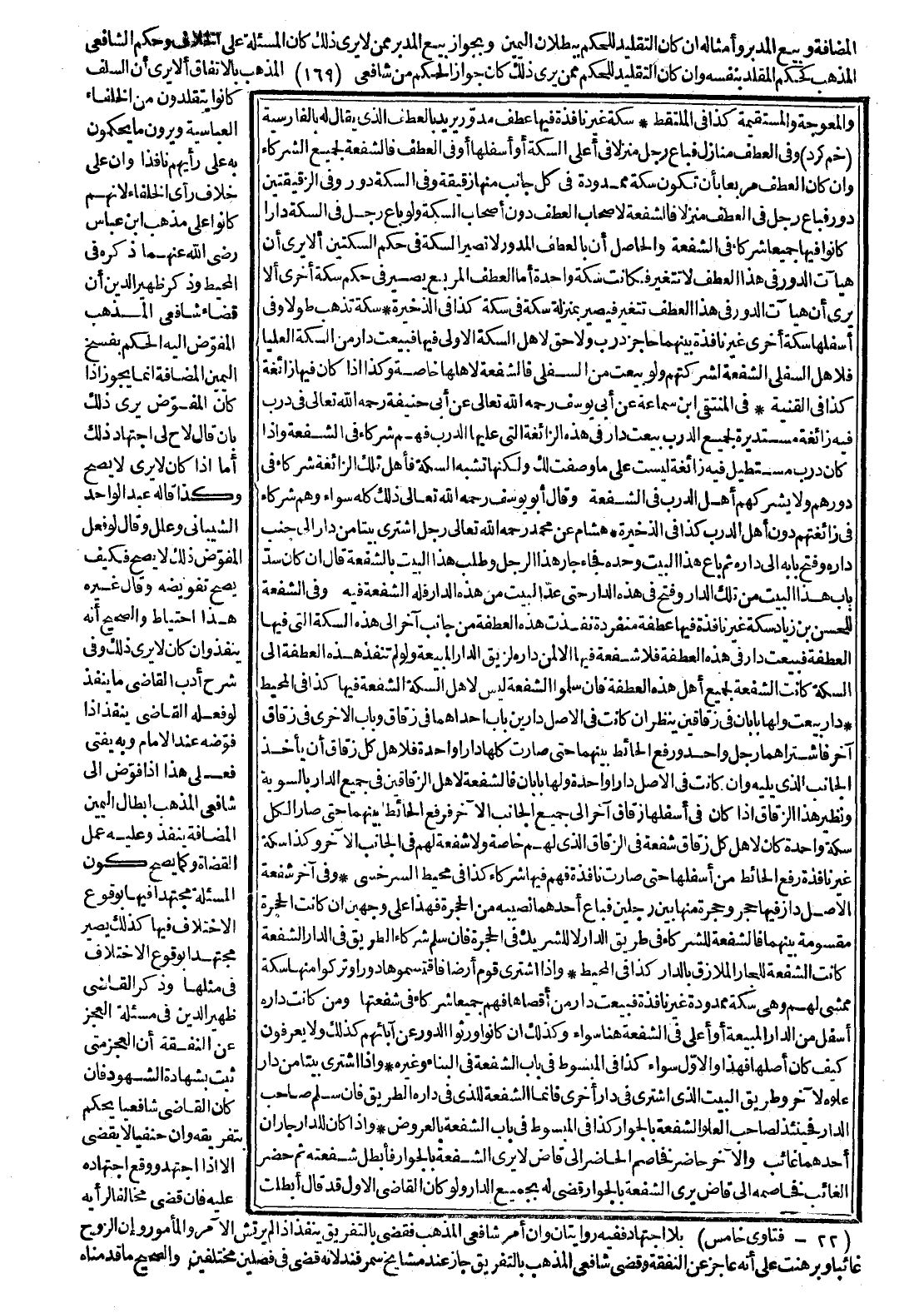 سِكَّةٌ غَيْرُ نَافِذَةٍ فِيهَا عَطْفٌ مُدَوَّرٌ يُرِيدُ بِالْعَطْفِ الَّذِي يُقَالُ لَهُ بِالْفَارِسِيَّةِ (خُمّ كَرِدِّ) وَفِي الْعَطْفِ مَنَازِلُ فَبَاعَ رَجُلٌ مَنْزِلًا فِي أَعْلَى السِّكَّةِ أَوْ أَسْفَلِهَا أَوْ فِي الْعَطْفِ فَالشُّفْعَةُ لِجَمِيعِ الشُّرَكَاءِ وَإِنْ كَانَ الْعَطْفُ مُرَبَّعًا بِأَنْ تَكُونَ سِكَّةً مَمْدُودَةً فِي كُلِّ جَانِبٍ مِنْهَا زُقَيْقَةٌ وَفِي السِّكَّةِ دُورٌ وَفِي الزَّقِيقَتَيْنِ دُورٌ فَبَاعَ رَجُلٌ فِي الْعَطْفِ مَنْزِلًا فَالشُّفْعَةُ لِأَصْحَابِ الْعَطْفِ دُونَ أَصْحَابِ السِّكَّةِ وَلَوْ بَاعَ رَجُلٌ فِي السِّكَّةِ دَارًا كَانُوا فِيهَا جَمِيعًا شُرَكَاءَ فِي الشُّفْعَةِ وَالْحَاصِلُ أَنَّ بِالْعَطْفِ الْمُدَوَّرِ لَا تَصِيرُ السِّكَّةُ فِي حُكْمِ السِّكَّتَيْنِ أَلَا يُرَى أَنَّ هَيْئَاتِ الدُّورِ فِي هَذَا الْعَطْفِ لَا تَتَغَيَّرُ فَكَانَتْ سِكَّةً وَاحِدَةَ أَمَّا الْعَطْفُ الْمُرَبَّعُ يَصِيرُ فِي حُكْمِ سِكَّةٍ أُخْرَى أَلَا يُرَى أَنَّ هَيْئَاتِ الدُّورِ فِي هَذَا الْعَطْفِ تَتَغَيَّرُ فَيَصِيرُ بِمَنْزِلَةِ سِكَّةٍ فِي سِكَّةٍ كَذَا فِي الذَّخِيرَةِ.