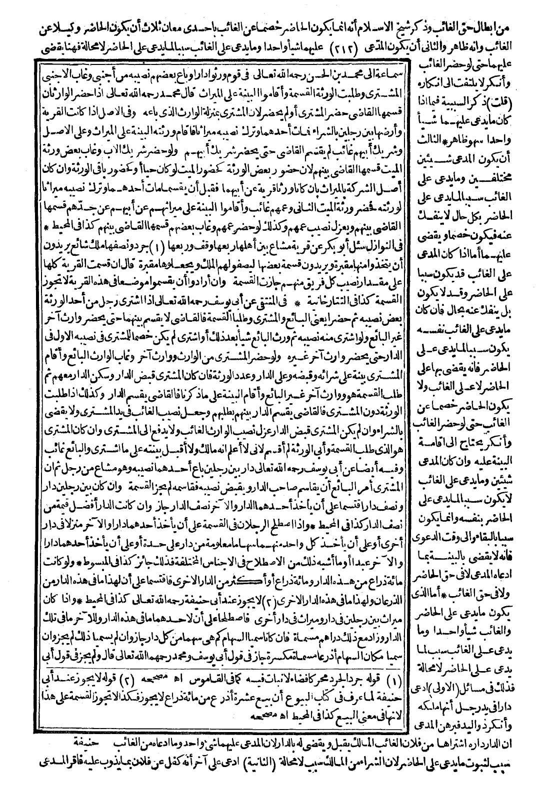 كَتَبَ ابْنُ سِمَاعَةَ إلَى مُحَمَّدِ بْنِ الْحَسَنِ - رَحِمَهُ اللَّهُ تَعَالَى - فِي قَوْمٍ وَرِثُوا دَارًا وَبَاعَ بَعْضُهُمْ نَصِيبَهُ مِنْ أَجْنَبِيٍّ وَغَابَ الْأَجْنَبِيُّ الْمُشْتَرِي وَطَلَبَتْ الْوَرَثَةُ الْقِسْمَةَ وَأَقَامُوا الْبَيِّنَةَ عَلَى الْمِيرَاثِ قَالَ مُحَمَّدٌ - رَحِمَهُ اللَّهُ تَعَالَى -: إذَا حَضَرَ الْوَارِثَانِ قَسَمَهَا الْقَاضِي حَضَرَ الْمُشْتَرِي أَوْ لَمْ يَحْضُرْ لِأَنَّ الْمُشْتَرِيَ بِمَنْزِلَةِ الْوَارِثِ الَّذِي بَاعَهُ وَفِي الْأَصْلِ إذَا كَانَتْ الْقَرْيَةُ وَأَرْضُهَا بَيْنَ رَجُلَيْنِ بِالشِّرَاءِ فَمَاتَ أَحَدُهُمَا وَتَرَكَ نَصِيبَهُ مِيرَاثًا فَأَقَامَ وَرَثَتُهُ الْبَيِّنَةَ عَلَى الْمِيرَاثِ وَعَلَى الْأَصْلِ وَشَرِيكُ أَبِيهِمْ غَائِبٌ لَمْ يَقْسِمْ الْقَاضِي حَتَّى يَحْضُرَ شَرِيكُ أَبِيهِمْ وَلَوْ حَضَرَ شَرِيكُ الْأَبِ وَغَابَ بَعْضُ وَرَثَةِ الْمَيِّتِ قَسَمَهَا الْقَاضِي بَيْنَهُمْ؛ لِأَنَّ حُضُورَ بَعْضِ الْوَرَثَةِ كَحُضُورِ الْمَيِّتِ لَوْ كَانَ حَيًّا أَوْ كَحُضُورِ بَاقِي الْوَرَثَةِ وَإِنْ كَانَ أَصْلُ الشَّرِكَةِ بِالْمِيرَاثِ بِأَنْ كَانَا وَرِثَا قَرْيَةً عَنْ أَبِيهِمَا فَقَبْلَ أَنْ يَقْسِمَا مَاتَ أَحَدُهُمَا وَتَرَكَ نَصِيبَهُ مِيرَاثًا لِوَرَثَتِهِ فَحَضَرَ وَرَثَةُ الْمَيِّتِ الثَّانِي وَعَمُّهُمْ غَائِبٌ وَأَقَامُوا الْبَيِّنَةَ عَلَى مِيرَاثِهِمْ عَنْ أَبِيهِمْ عَنْ جَدِّهِمْ قَسَمَهَا الْقَاضِي بَيْنَهُمْ وَيَعْزِلُ نَصِيبَ عَمِّهِمْ، وَكَذَلِكَ لَوْ حَضَرَ عَمُّهُمْ وَغَابَ بَعْضُهُمْ قَسَمَهَا الْقَاضِي بَيْنَهُمْ كَذَا فِي الْمُحِيطِ.