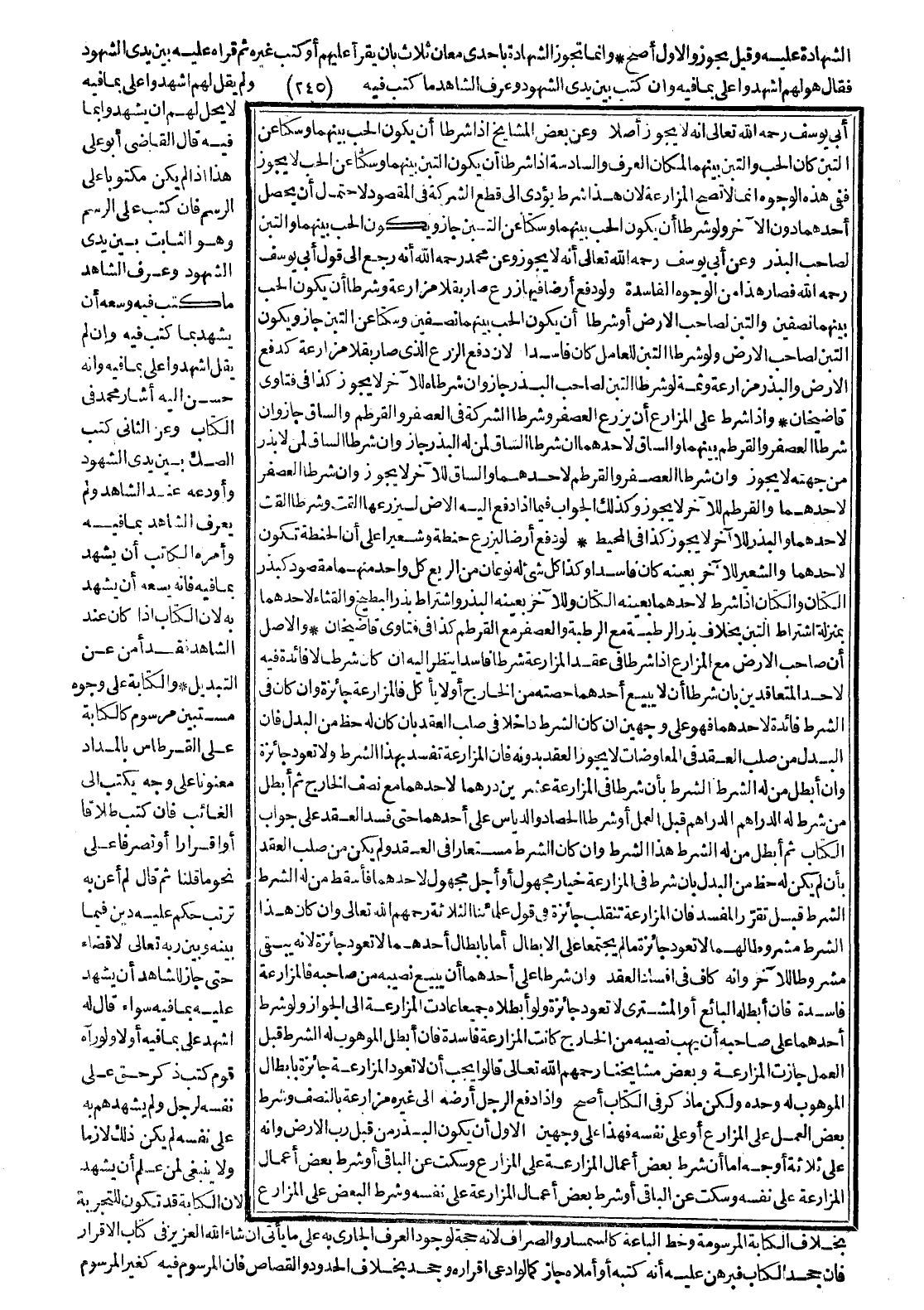 وَالْأَصْلُ أَنَّ صَاحِبَ الْأَرْضِ مَعَ الْمُزَارِعِ إذَا شَرَطَا فِي عَقْدِ الْمُزَارَعَةِ شَرْطًا فَاسِدًا يُنْظَرُ إلَيْهِ إنْ كَانَ شَرْطًا لَا فَائِدَةَ فِيهِ لِأَحَدِ الْمُتَعَاقِدَيْنِ بِأَنْ شَرَطَا أَنْ لَا يَبِيعَ أَحَدُهُمَا حِصَّتَهُ مِنْ الْخَارِجِ أَوْ لَا يَأْكُلَ فَالْمُزَارَعَةُ جَائِزَةٌ وَإِنْ كَانَ فِي الشَّرْطِ فَائِدَةٌ لِأَحَدِهِمَا فَهُوَ عَلَى وَجْهَيْنِ إنْ كَانَ الشَّرْطُ دَاخِلًا فِي صُلْبِ الْعَقْدِ بِأَنْ كَانَ لَهُ حَظٌّ مِنْ الْبَدَلِ فَإِنَّ الْبَدَلَ مِنْ صُلْبِ الْعَقْدِ فِي الْمُعَاوَضَاتِ لَا يَجُوزُ الْعَقْدُ بِدُونِهِ فَإِنَّ الْمُزَارَعَةَ تَفْسُدُ بِهَذَا الشَّرْطِ وَلَا تَعُودُ جَائِزَةً، وَإِنْ أَبْطَلَ مَنْ لَهُ الشَّرْطُ الشَّرْطَ بِأَنْ شَرَطَا فِي الْمُزَارَعَةِ عِشْرِينَ دِرْهَمًا لِأَحَدِهِمَا مَعَ نِصْفِ الْخَارِجِ ثُمَّ أَبْطَلَ مَنْ شُرِطَ لَهُ الدَّرَاهِمُ الدَّرَاهِمَ قَبْلَ الْعَمَلِ، أَوْ شَرَطَا الْحَصَادَ وَالدِّيَاسَ عَلَى أَحَدِهِمَا حَتَّى فَسَدَ الْعَقْدُ عَلَى جَوَابِ الْكِتَابِ ثُمَّ أَبْطَلَ مَنْ لَهُ الشَّرْطُ هَذَا الشَّرْطَ، وَإِنْ كَانَ الشَّرْطُ مُسْتَعَارًا فِي الْعَقْدِ وَلَمْ يَكُنْ مِنْ صُلْبِ الْعَقْدِ بِأَنْ لَمْ يَكُنْ لَهُ حَظٌّ مِنْ الْبَدَلِ بِأَنْ شَرَطَ فِي الْمُزَارَعَةِ خِيَارَ مَجْهُولٍ أَوْ أَجَلَ مَجْهُولٍ لِأَحَدِهِمَا فَأَسْقَطَ مَنْ لَهُ الشَّرْطُ الشَّرْطَ قَبْلَ تَقَرُّرِ الْمُفْسِدِ فَإِنَّ الْمُزَارَعَةَ تَنْقَلِبُ جَائِزَةً فِي قَوْلِ عُلَمَائِنَا الثَّلَاثَةِ رَحِمَهُمْ اللَّهُ تَعَالَى، وَإِنْ كَانَ هَذَا الشَّرْطُ مَشْرُوطًا لَهُمَا لَا تَعُودُ جَائِزَةً مَا لَمْ يَجْتَمِعَا عَلَى الْإِبْطَالِ.