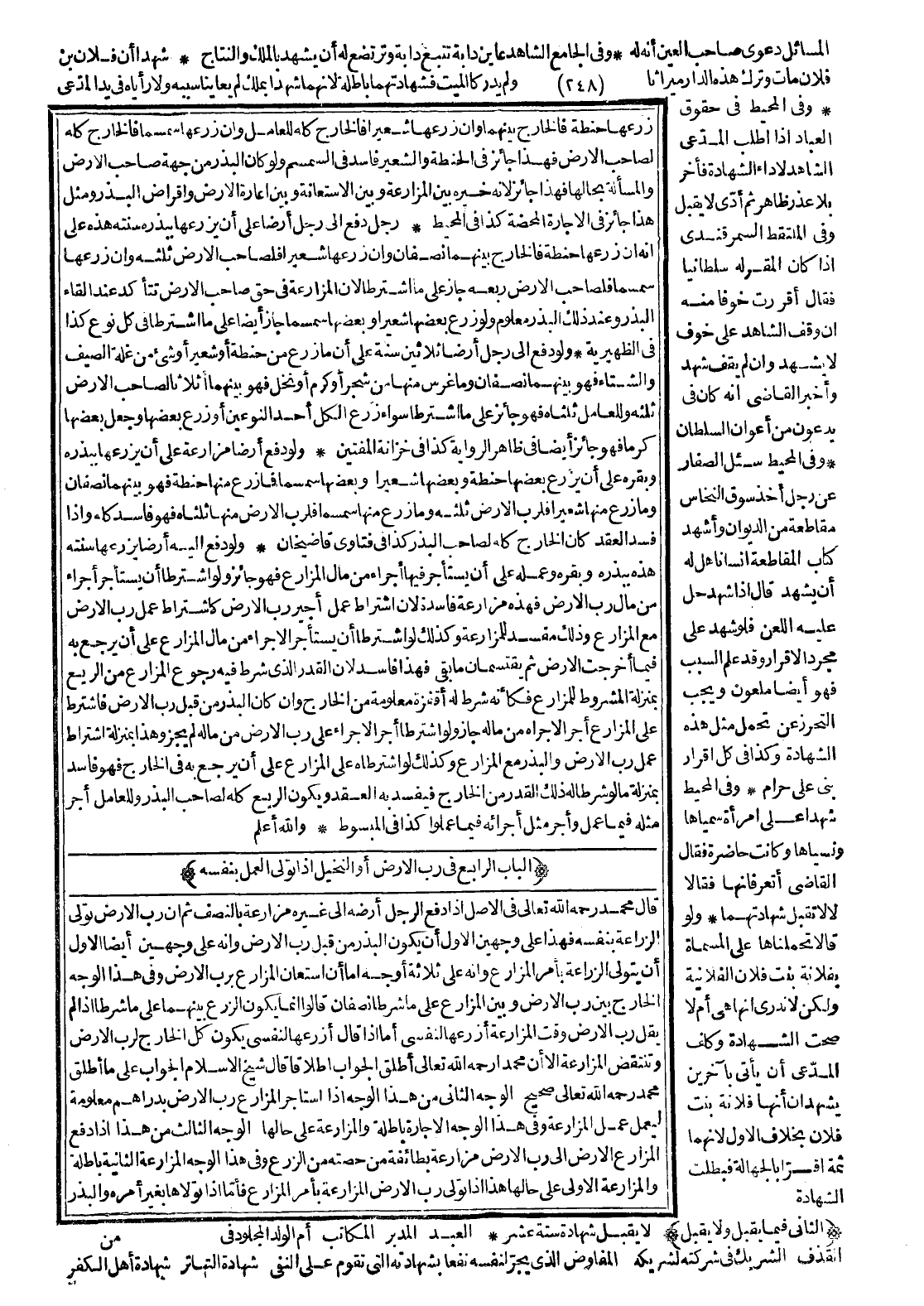 (الْبَابُ الرَّابِعُ فِي رَبِّ الْأَرْضِ أَوْ النَّخِيلِ إذَا تَوَلَّى الْعَمَلَ بِنَفْسِهِ) قَالَ مُحَمَّدٌ - رَحِمَهُ اللَّهُ تَعَالَى - فِي الْأَصْلِ إذَا دَفَعَ الرَّجُلُ أَرْضَهُ إلَى غَيْرِهِ مُزَارَعَةً بِالنِّصْفِ ثُمَّ إنَّ رَبَّ الْأَرْضِ تَوَلَّى الزِّرَاعَةَ بِنَفْسِهِ فَهَذَا عَلَى وَجْهَيْنِ: الْأَوَّلُ أَنْ يَكُونَ الْبَذْرُ مِنْ قِبَلِ رَبِّ الْأَرْضِ وَإِنَّهُ عَلَى وَجْهَيْنِ أَيْضًا: الْأَوَّلُ أَنْ يَتَوَلَّى الزِّرَاعَةَ بِأَمْرِ الْمُزَارِعِ وَأَنَّهُ عَلَى ثَلَاثَةِ أَوْجُهٍ أَمَّا إنْ اسْتَعَانَ الْمُزَارِعُ بِرَبِّ الْأَرْضِ وَفِي هَذَا الْوَجْهِ الْخَارِجُ بَيْنَ رَبِّ الْأَرْضِ وَبَيْنَ الْمُزَارِعِ عَلَى مَا شَرَطَا نِصْفَانِ قَالُوا: إنَّمَا يَكُونُ الزَّرْعُ بَيْنَهُمَا عَلَى مَا شَرَطَا إذَا لَمْ يَقُلْ رَبُّ الْأَرْضِ وَقْتَ الْمُزَارَعَةِ: أَزْرَعُهَا لِنَفْسِي أَمَّا إذَا قَالَ: أَزْرَعُهَا لِنَفْسِي يَكُونُ كُلُّ الْخَارِجِ لِرَبِّ الْأَرْضِ وَتُنْتَقَضُ الْمُزَارَعَةُ إلَّا أَنَّ مُحَمَّدًا - رَحِمَهُ اللَّهُ تَعَالَى - أَطْلَقَ الْجَوَابَ إطْلَاقًا قَالَ شَيْخُ الْإِسْلَامِ: الْجَوَابُ عَلَى مَا أَطْلَقَ مُحَمَّدٌ - رَحِمَهُ اللَّهُ تَعَالَى - صَحِيحٌ، الْوَجْهُ الثَّانِي مِنْ هَذَا الْوَجْهِ إذَا اسْتَأْجَرَ الْمُزَارِعُ رَبَّ الْأَرْضِ بِدَرَاهِمَ مَعْلُومَةٍ لِيَعْمَلَ عَمَلَ الْمُزَارَعَةِ وَفِي هَذَا الْوَجْهِ الْإِجَارَةُ بَاطِلَةٌ وَالْمُزَارَعَةُ عَلَى حَالِهَا، الْوَجْهُ الثَّالِثُ مِنْ هَذَا إذَا دَفَعَ الْمُزَارِعُ الْأَرْضَ إلَى رَبِّ الْأَرْضِ مُزَارَعَةً بِطَائِفَةٍ مِنْ حِصَّتِهِ مِنْ الزَّرْعِ وَفِي هَذَا الْوَجْهِ الْمُزَارَعَةُ الثَّانِيَةُ بَاطِلَةٌ وَالْمُزَارَعَةُ الْأُولَى عَلَى حَالِهَا هَذَا إذَا تَوَلَّى رَبُّ الْأَرْضِ الْمُزَارَعَةَ بِأَمْرِ الْمُزَارِعِ، فَأَمَّا إذَا تَوَلَّاهَا بِغَيْرِ أَمْرِهِ وَالْبَذْرُ.