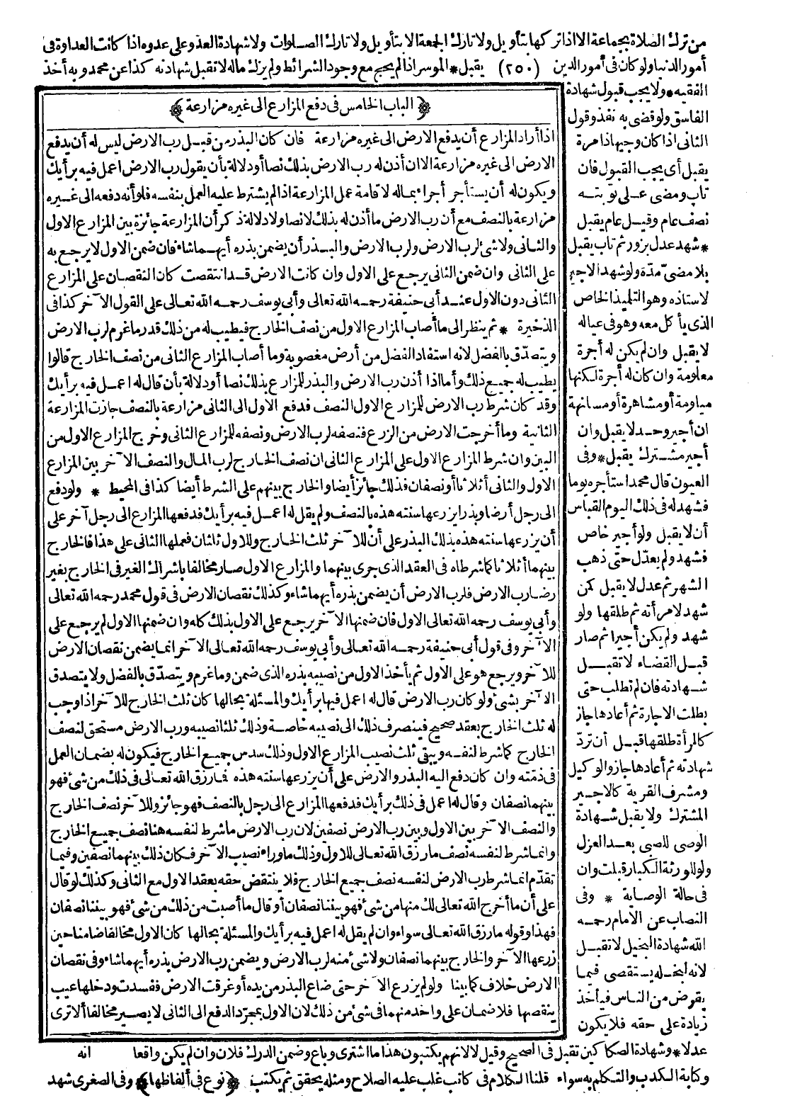 وَذَلِكَ ثُلُثَا نَصِيبِهِ وَرَبُّ الْأَرْضِ مُسْتَحِقٌّ لِنِصْفِ الْخَارِجِ كَمَا شَرَطَ لِنَفْسِهِ وَيَبْقَى ثُلُثُ نَصِيبِ الْمُزَارِعِ الْأَوَّلِ وَذَلِكَ سُدُسُ جَمِيعِ الْخَارِجِ فَيَكُونُ لَهُ بِضَمَانِ الْعَمَلِ فِي ذِمَّتِهِ وَإِنْ كَانَ دَفَعَ إلَيْهِ الْبَذْرَ وَالْأَرْضَ عَلَى أَنْ يَزْرَعَهَا سَنَتَهُ هَذِهِ فَمَا رَزَقَ اللَّهُ تَعَالَى فِي ذَلِكَ مِنْ شَيْءٍ فَهُوَ بَيْنَهُمَا نِصْفَانِ وَقَالَ لَهُ: اعْمَلْ فِي ذَلِكَ بِرَأْيِك فَدَفَعَهَا الْمُزَارِعُ إلَى رَجُلٍ بِالنِّصْفِ فَهُوَ جَائِزٌ وَلِلْآخَرِ نِصْفُ الْخَارِجِ وَالنِّصْفُ الْآخَرُ بَيْنَ الْأَوَّلِ وَبَيْنَ رَبِّ الْأَرْضِ نِصْفَيْنِ لِأَنَّ رَبَّ الْأَرْضِ مَا شَرَطَ لِنَفْسِهِ هُنَا نِصْفُ جَمِيعِ الْخَارِجِ وَإِنَّمَا شَرَطَ لِنَفْسِهِ نِصْفَ مَا رَزَقَ اللَّهُ تَعَالَى لِلْأَوَّلِ وَذَلِكَ مَا وَرَاءُ نَصِيبِ الْآخَرِ فَكَانَ ذَلِكَ بَيْنَهُمَا نِصْفَيْنِ وَفِيمَا تَقَدَّمَ إنَّمَا شَرَطَ رَبُّ الْأَرْضِ لِنَفْسِهِ نِصْفَ جَمِيعِ الْخَارِجِ فَلَا يُنْتَقَضُ حَقُّهُ بِعَقْدِ الْأَوَّلِ مَعَ الثَّانِي وَكَذَلِكَ لَوْ قَالَ: عَلَى أَنَّ مَا أَخْرَجَ اللَّهُ تَعَالَى لَكَ مِنْهَا مِنْ شَيْءٍ فَهُوَ بَيْنَنَا نِصْفَانِ أَوْ قَالَ: مَا أَصَبْتَ مِنْ ذَلِكَ مِنْ شَيْءٍ فَهُوَ بَيْنَنَا نِصْفَانِ فَهَذَا وَقَوْلُهُ مَا رَزَقَ اللَّهُ تَعَالَى سَوَاءٌ وَإِنْ لَمْ يَقُلْ لَهُ: اعْمَلْ فِيهِ بِرَأْيِك وَالْمَسْأَلَةُ بِحَالِهَا كَانَ الْأَوَّلُ مُخَالِفًا ضَامِنًا حِينَ زَرَعَهَا الْآخَرُ وَالْخَارِجُ بَيْنَهُمَا نِصْفَانِ وَلَا شَيْءَ مِنْهُ لِرَبِّ الْأَرْضِ وَيُضَمِّنُ رَبُّ الْأَرْضِ بَذْرَهُ أَيَّهمَا شَاءَ وَفِي نُقْصَانِ الْأَرْضِ خِلَافٌ كَمَا بَيَّنَّا وَلَوْ لَمْ يَزْرَعْ الْآخَرُ حَتَّى ضَاعَ الْبَذْرُ مِنْ يَدِهِ أَوْ غَرِقَتْ الْأَرْضُ فَفَسَدَتْ وَدَخَلَهَا عَيْبٌ يُنْقِصُهَا فَلَا ضَمَانَ عَلَى وَاحِدٍ مِنْهُمَا فِي شَيْءٍ مِنْ ذَلِكَ لِأَنَّ الْأَوَّلَ بِمُجَرَّدِ الدَّفْعِ إلَى الثَّانِي لَا يَصِيرُ مُخَالِفًا أَلَا تَرَى.