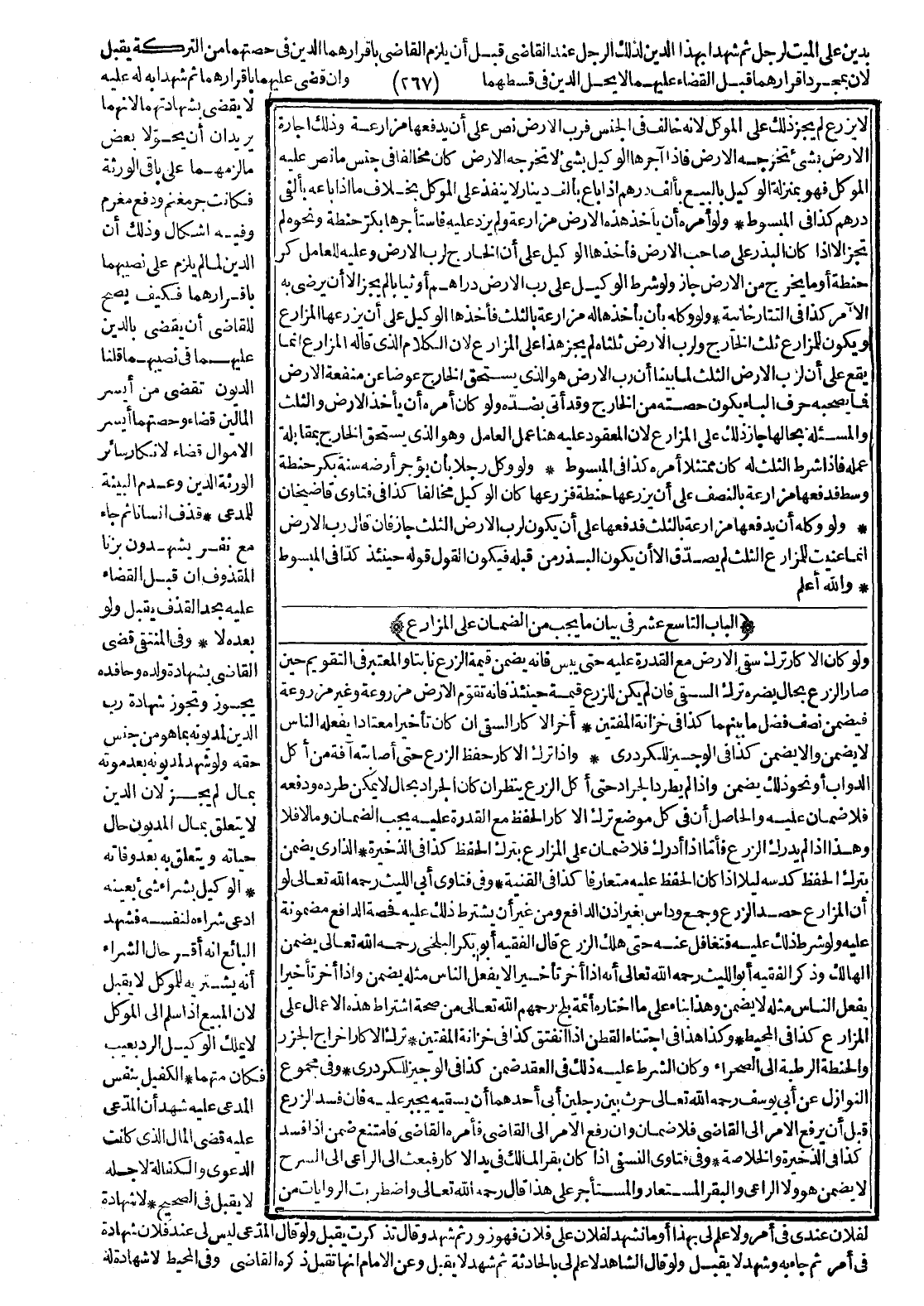 (الْبَابُ التَّاسِعَ عَشَرَ فِي بَيَانِ مَا يَجِبُ مِنْ الضَّمَانِ عَلَى الْمُزَارِعِ) وَلَوْ كَانَ الْأَكَّارُ تَرَكَ سَقْيَ الْأَرْضِ مَعَ الْقُدْرَةِ عَلَيْهِ حَتَّى يَبِسَ فَإِنَّهُ يَضْمَنُ قِيمَةَ الزَّرْعِ نَابِتًا وَالْمُعْتَبَرُ فِي التَّقْوِيمِ حِينَ صَارَ الزَّرْعُ بِحَالٍ يَضُرُّهُ تَرْكُ السَّقْيِ، فَإِنْ لَمْ يَكُنْ لِلزَّرْعِ قِيمَةٌ حِينَئِذٍ فَإِنَّهُ تُقَوَّمُ الْأَرْضُ مَزْرُوعَةً وَغَيْرَ مَزْرُوعَةٍ فَيَضْمَنُ نِصْفَ فَضْلِ مَا بَيْنَهُمَا، كَذَا فِي خِزَانَةِ الْمُفْتِينَ.