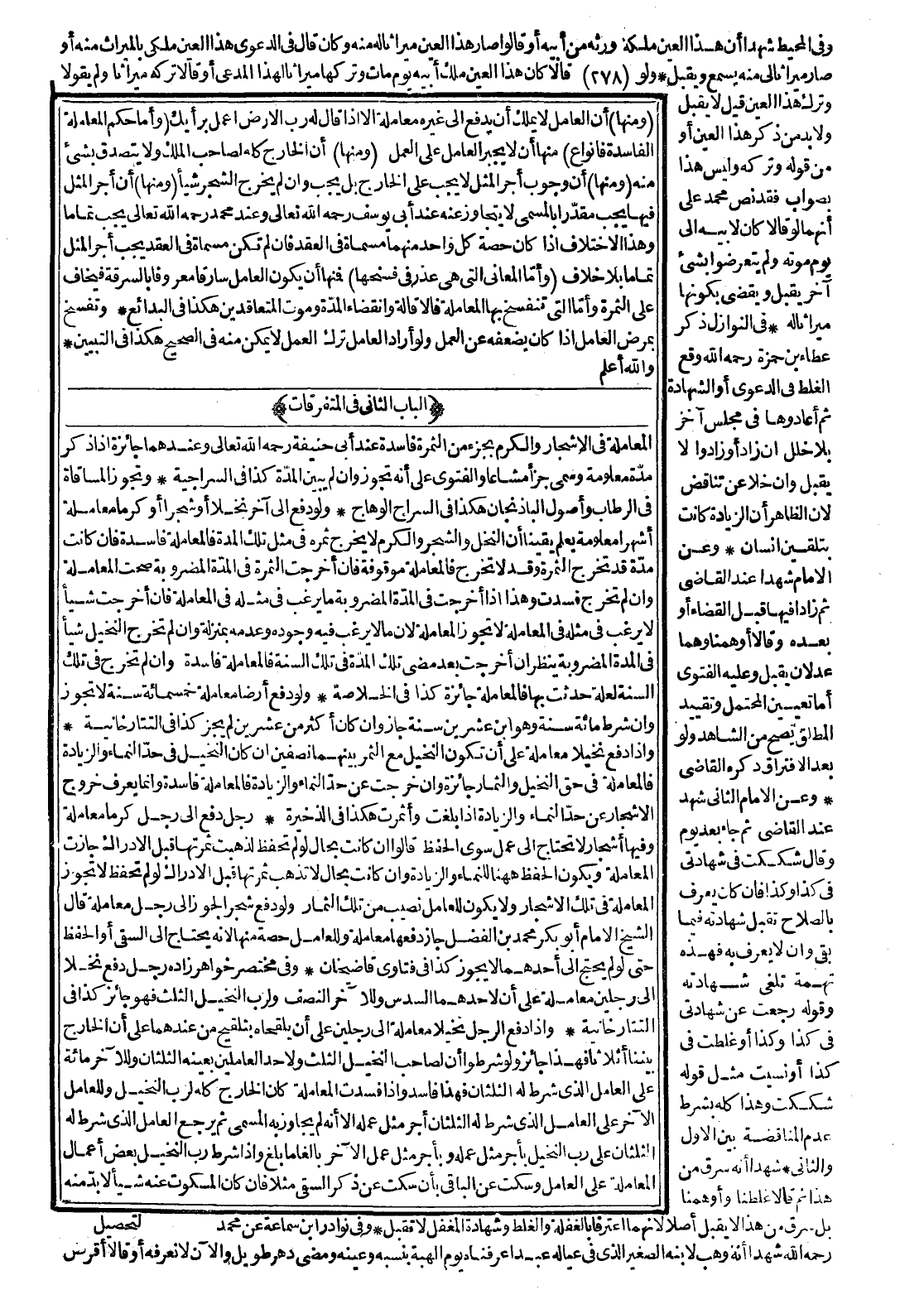 (الْبَابُ الثَّانِي فِي الْمُتَفَرِّقَاتِ) الْمُعَامَلَةُ فِي الْأَشْجَارِ وَالْكَرْمِ بِجُزْءٍ مِنْ الثَّمَرَةِ فَاسِدَةٌ عِنْدَ أَبِي حَنِيفَةَ - رَحِمَهُ اللَّهُ تَعَالَى -، وَعِنْدَهُمَا جَائِزَةٌ إذَا ذَكَرَ مُدَّةً مَعْلُومَةً وَسَمَّى جُزْءًا مُشَاعًا وَالْفَتْوَى عَلَى أَنَّهُ تَجُوزُ، وَإِنْ لَمْ يُبَيِّنْ الْمُدَّةَ، كَذَا فِي السِّرَاجِيَّةَ.