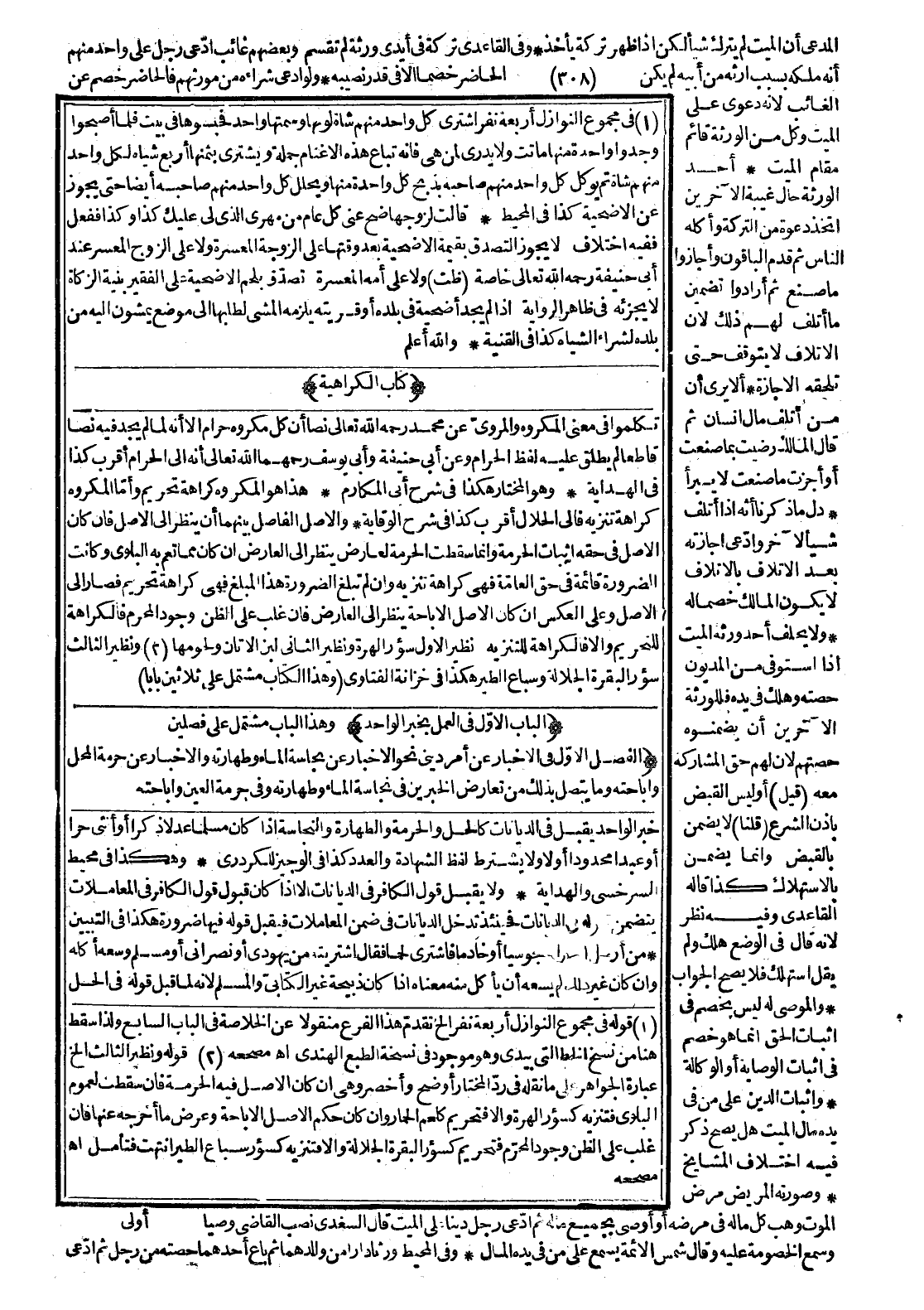 (كِتَابُ الْكَرَاهِيَةِ) تَكَلَّمُوا فِي مَعْنَى الْمَكْرُوهِ، وَالْمَرْوِيُّ عَنْ مُحَمَّدٍ - رَحِمَهُ اللَّهُ تَعَالَى - نَصًّا أَنَّ كُلَّ مَكْرُوهٍ حَرَامٌ إلَّا أَنَّهُ لَمَّا لَمْ يَجِدْ فِيهِ نَصًّا قَاطِعًا لَمْ يُطْلِقْ عَلَيْهِ لَفْظَ الْحَرَامِ، وَعَنْ أَبِي حَنِيفَةَ وَأَبِي يُوسُفَ - رَحِمَهُمَا اللَّهُ تَعَالَى - أَنَّهُ إلَى الْحَرَامِ أَقْرَبُ كَذَا فِي الْهِدَايَةِ. وَهُوَ الْمُخْتَارُ، هَكَذَا فِي شَرْحِ أَبِي الْمَكَارِمِ. هَذَا هُوَ الْمَكْرُوهُ كَرَاهَةَ تَحْرِيمٍ، وَأَمَّا الْمَكْرُوهُ كَرَاهَةَ تَنْزِيهٍ فَإِلَى الْحَلَالِ أَقْرَبُ، كَذَا فِي شَرْحِ الْوُقَايَةِ. وَالْأَصْلُ الْفَاصِلُ بَيْنَهُمَا أَنْ يُنْظَرَ إلَى الْأَصْلِ، فَإِنْ كَانَ الْأَصْلُ فِي حَقِّهِ إثْبَاتُ الْحُرْمَةِ وَإِنَّمَا سَقَطَتْ الْحُرْمَةُ لِعَارِضٍ، يُنْظَرُ إلَى الْعَارِضِ إنْ كَانَ مِمَّا تَعُمُّ بِهِ الْبَلْوَى وَكَانَتْ الضَّرُورَةُ قَائِمَةً فِي حَقِّ الْعَامَّةِ فَهِيَ كَرَاهَةُ تَنْزِيهٍ، وَإِنْ لَمْ تَبْلُغْ الضَّرُورَةُ هَذَا الْمَبْلَغَ فَهِيَ كَرَاهَةُ تَحْرِيمٍ فَصَارَ إلَى الْأَصْلِ، وَعَلَى الْعَكْسِ إنْ كَانَ الْأَصْلُ الْإِبَاحَةَ يُنْظَرُ إلَى الْعَارِضِ، فَإِنْ غَلَبَ عَلَى الظَّنِّ وُجُودُ الْمُحَرَّمِ فَالْكَرَاهَةُ لِلتَّحْرِيمِ وَإِلَّا فَالْكَرَاهَةُ لِلتَّنْزِيهِ، نَظِيرُ الْأَوَّلِ سُؤْرُ الْهِرَّةِ، وَنَظِيرُ الثَّانِي لَبَنُ الْأَتَانِ وَلُحُومُهَا، وَنَظِيرُ الثَّالِثِ سُؤْرُ الْبَقَرَةِ الْجَلَّالَةِ وَسِبَاعِ الطَّيْرِ هَكَذَا فِي خِزَانَةِ الْفَتَاوَى. (وَهَذَا الْكِتَابُ مُشْتَمِلٌ عَلَى ثَلَاثِينَ بَابًا) .