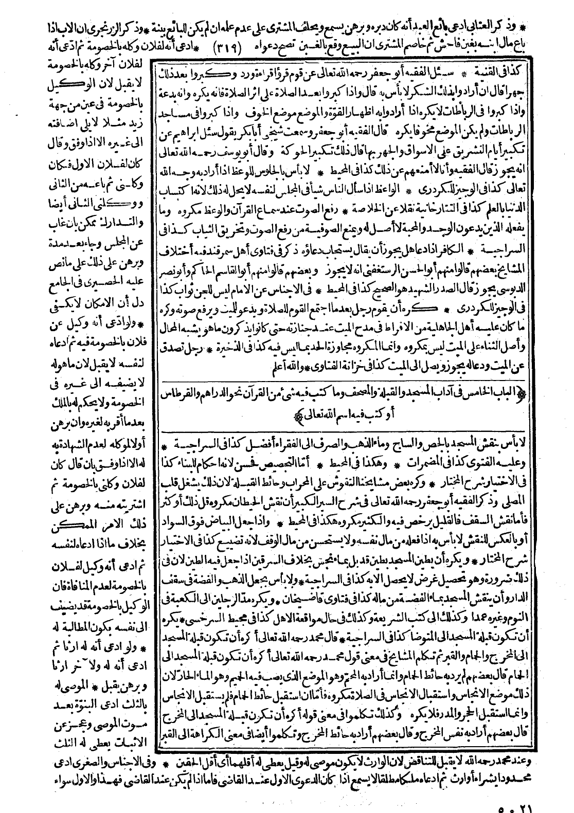 (الْبَابُ الْخَامِسُ فِي آدَابِ الْمَسْجِدِ وَالْقِبْلَةِ وَالْمُصْحَفِ وَمَا كُتِبَ فِيهِ شَيْءٌ مِنْ الْقُرْآنِ نَحْوُ الدَّرَاهِمِ وَالْقِرْطَاسِ أَوْ كُتِبَ فِيهِ اسْمُ اللَّهِ تَعَالَى) لَا بَأْسَ بِنَقْشِ الْمَسْجِدِ بِالْجِصِّ وَالسَّاجِ وَمَاءِ الذَّهَبِ، وَالصَّرْفُ إلَى الْفُقَرَاءِ أَفْضَلُ، كَذَا فِي السِّرَاجِيَّةِ. وَعَلَيْهِ الْفَتْوَى، كَذَا فِي الْمُضْمَرَاتِ. وَهَكَذَا فِي الْمُحِيطِ. أَمَّا التَّجْصِيصُ فَحَسَنٌ؛ لِأَنَّهُ إحْكَامٌ لِلْبِنَاءِ، كَذَا فِي الِاخْتِيَارِ شَرْحِ الْمُخْتَارِ.