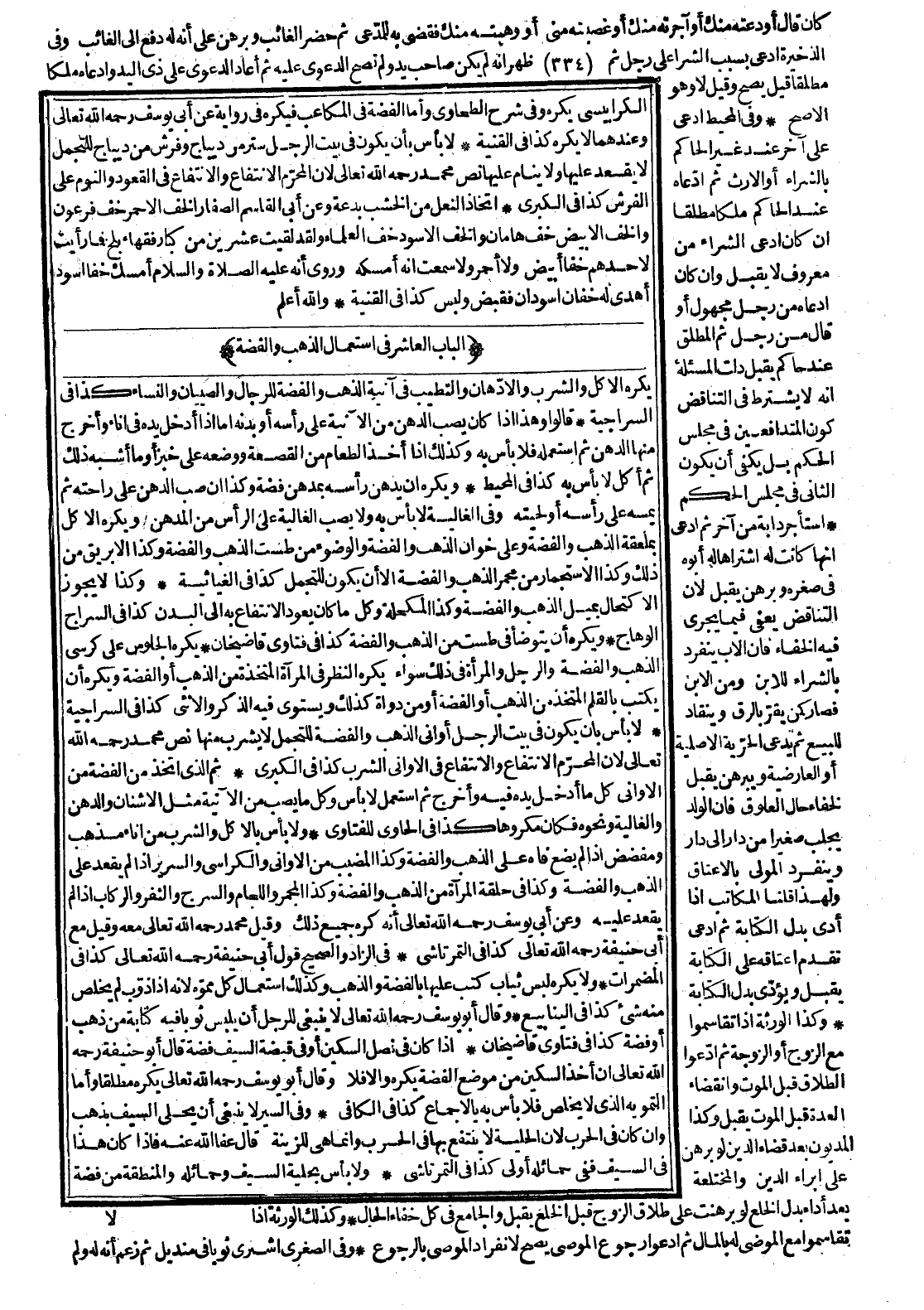 (الْبَابُ الْعَاشِرُ فِي اسْتِعْمَالِ الذَّهَبِ وَالْفِضَّةِ) يُكْرَهُ الْأَكْلُ وَالشُّرْبُ وَالْأَدْهَانُ وَالتَّطَيُّبُ فِي آنِيَةِ الذَّهَبِ وَالْفِضَّةِ لِلرِّجَالِ وَالصِّبْيَانِ وَالنِّسَاءِ كَذَا فِي السِّرَاجِيَّةِ.