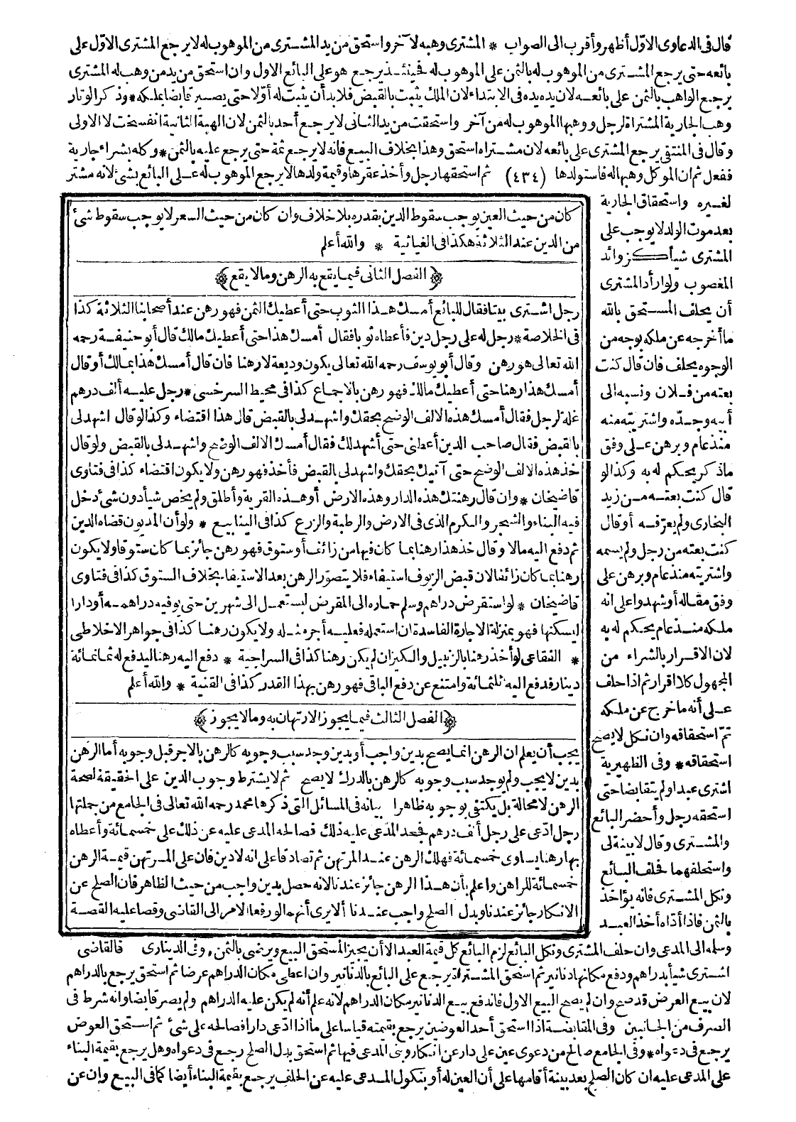 (الْفَصْلُ الثَّالِثُ فِيمَا يَجُوزُ الِارْتِهَانُ بِهِ وَمَا لَا يَجُوزُ) يَجِبُ أَنْ يُعْلَمَ أَنَّ الرَّهْنَ إنَّمَا يَصِحُّ بِدَيْنٍ وَاجِبٍ أَوْ بِدَيْنٍ وُجِدَ سَبَبُ وُجُوبِهِ كَالرَّهْنِ بِالْأَجْرِ قَبْلَ وُجُوبِهِ أَمَّا الرَّهْنُ بِدَيْنٍ لَا يَجِبُ، وَلَمْ يُوجَدْ سَبَبُ وُجُوبِهِ كَالرَّهْنِ بِالدَّرْكِ لَا يَصِحُّ ثُمَّ لَا يُشْتَرَطُ وُجُوبُ الدَّيْنِ عَلَى الْحَقِيقَةِ لِصِحَّةِ الرَّهْنِ لَا مَحَالَةَ بَلْ يُكْتَفَى بِوُجُوبِهِ ظَاهِرًا بَيَانُهُ فِي الْمَسَائِلِ الَّتِي ذَكَرَهَا مُحَمَّدٌ - رَحِمَهُ اللَّهُ تَعَالَى - فِي الْجَامِعِ مِنْ جُمْلَتِهَا: رَجُلٌ ادَّعَى عَلَى رَجُلٍ أَلْفَ دِرْهَمٍ فَجَحَدَ الْمُدَّعَى عَلَيْهِ ذَلِكَ، فَصَالَحَهُ الْمُدَّعَى عَلَيْهِ عَنْ ذَلِكَ عَلَى خَمْسِمِائَةٍ، وَأَعْطَاهُ بِهَا رَهْنًا يُسَاوِي خَمْسَمِائَةٍ فَهَلَكَ الرَّهْنُ عِنْدَ الْمُرْتَهِنِ ثُمَّ تَصَادَقَا عَلَى أَنَّهُ لَا دَيْنَ فَإِنَّ عَلَى الْمُرْتَهِنِ قِيمَةَ الرَّهْنِ خَمْسَمِائَةٍ لِلرَّاهِنِ وَاعْلَمْ بِأَنَّ هَذَا الرَّهْنَ جَائِزٌ عِنْدَنَا؛ لِأَنَّهُ حَصَلَ بِدَيْنٍ وَاجِبٍ مِنْ حَيْثُ الظَّاهِرُ، فَإِنَّ الصُّلْحَ عَنْ الْإِنْكَارِ جَائِزٌ عِنْدَنَا، وَبَدَلُ الصُّلْحِ وَاجِبٌ عِنْدَنَا، أَلَا يَرَى أَنَّهُمَا لَوْ رَفَعَا الْأَمْرَ إلَى الْقَاضِي وَقَصَّا عَلَيْهِ الْقِصَّةَ