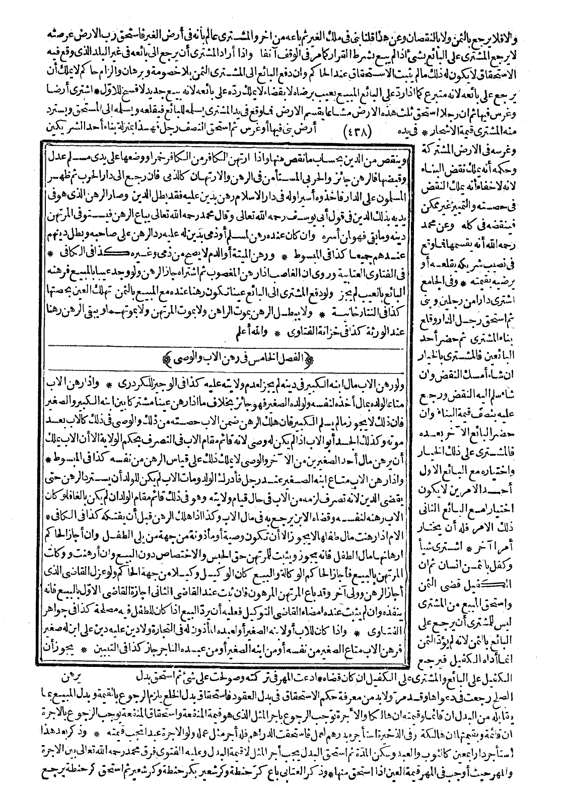 (الْفَصْلُ الْخَامِسُ فِي رَهْنِ الْأَبِ وَالْوَصِيِّ) وَلَوْ رَهَنَ الْأَبُ مَالَ ابْنِهِ الْكَبِيرِ فِي دَيْنِهِ لَمْ يَجُزْ لِعَدَمِ وِلَايَتِهِ عَلَيْهِ كَذَا فِي الْوَجِيزِ لِلْكَرْدَرِيِّ.