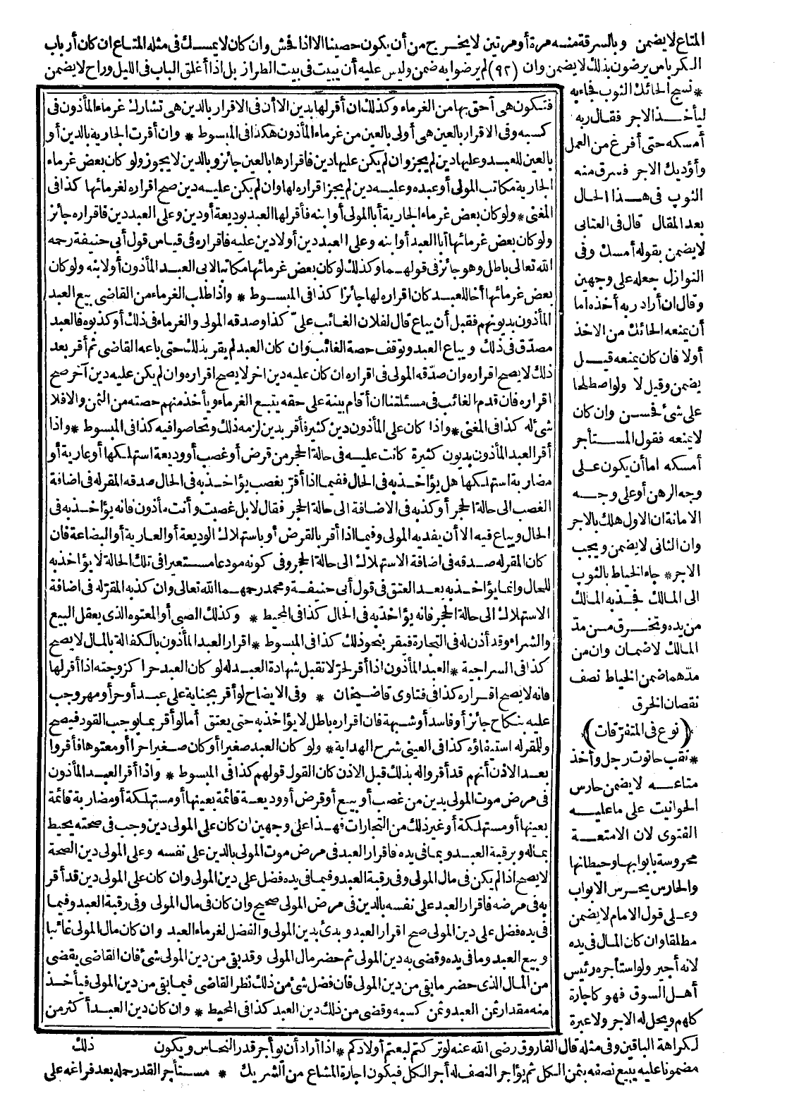 وَإِذَا أَقَرَّ الْعَبْدُ الْمَأْذُونُ فِي مَرَضِ مَوْتِ الْمَوْلَى بِدَيْنٍ مِنْ غَصْبٍ أَوْ بَيْعٍ أَوْ قَرْضٍ أَوْ وَدِيعَةٍ قَائِمَةٍ بِعَيْنِهَا أَوْ مُسْتَهْلَكَةٍ أَوْ مُضَارَبَةٍ قَائِمَةٍ بِعَيْنِهَا أَوْ مُسْتَهْلَكَةٍ أَوْ غَيْرِ ذَلِكَ مِنْ التِّجَارَاتِ فَهَذَا عَلَى وَجْهَيْنِ: إنْ كَانَ عَلَى الْمَوْلَى دَيْنٌ وَجَبَ فِي صِحَّتِهِ يُحِيطُ بِمَالِهِ وَبِرَقَبَةِ الْعَبْدِ وَبِمَا فِي يَدِهِ فَإِقْرَارُ الْعَبْدِ فِي مَرَضِ مَوْتِ الْمَوْلَى بِالدَّيْنِ عَلَى نَفْسِهِ، وَعَلَى الْمَوْلَى دَيْنُ الصِّحَّةِ لَا يَصِحُّ إذَا لَمْ يَكُنْ فِي مَالِ الْمَوْلَى، وَفِي رَقَبَةِ الْعَبْدِ وَفِيمَا فِي يَدِهِ فَضْلٌ عَلَى دَيْنِ الْمَوْلَى، وَإِنْ كَانَ عَلَى الْمَوْلَى دَيْنٌ قَدْ أَقَرَّ بِهِ فِي مَرَضِهِ فَإِقْرَارُ الْعَبْدِ عَلَى نَفْسِهِ بِالدَّيْنِ فِي مَرَضِ الْمَوْلَى صَحِيحٌ، وَإِنْ كَانَ فِي مَالِ الْمَوْلَى وَفِي رَقَبَةِ الْعَبْدِ وَفِيمَا فِي يَدِهِ فَضْلٌ عَلَى دَيْنِ الْمَوْلَى صَحَّ إقْرَارُ الْعَبْدِ وَبُدِئَ بِدَيْنِ الْمَوْلَى وَالْفَضْلُ لِغُرَمَاءِ الْعَبْدِ، وَإِنْ كَانَ مَالُ الْمَوْلَى غَائِبًا وَبِيعَ الْعَبْدُ وَمَا فِي يَدِهِ وَقُضِيَ بِهِ دَيْنُ الْمَوْلَى ثُمَّ حَضَرَ مَالُ الْمَوْلَى، وَقَدْ بَقِيَ مِنْ دَيْنِ الْمَوْلَى شَيْءٌ فَإِنَّ الْقَاضِيَ يَقْضِي مِنْ الْمَالِ الَّذِي حَضَرَ مَا بَقِيَ مِنْ دَيْنِ الْمَوْلَى فَإِنْ فَضَلَ شَيْءٌ مِنْ ذَلِكَ نَظَرَ الْقَاضِي فِيمَا بَقِيَ مِنْ دَيْنِ الْمَوْلَى فَيَأْخُذُ مِنْهُ مِقْدَارَ ثَمَنِ الْعَبْدِ وَثَمَنِ كَسْبِهِ، وَقَضَى مِنْ ذَلِكَ دَيْنَ الْعَبْدِ كَذَا فِي الْمُحِيطِ.