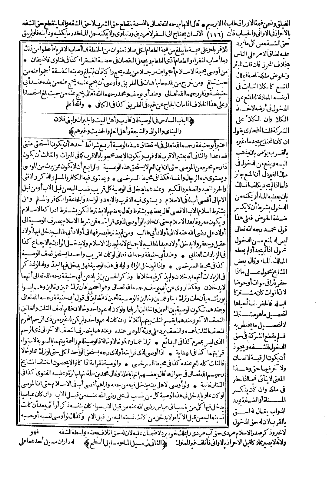 (الْبَابُ السَّادِسُ فِي الْوَصِيَّةِ لِلْأَقَارِبِ وَأَهْلِ الْبَيْتِ وَالْجِيرَانِ وَلِبَنِي فُلَانٍ وَالْيَتَامَى وَالْمَوَالِي وَالشِّيعَةِ وَأَهْلِ الْعِلْمِ وَالْحَدِيثِ وَغَيْرِهِمْ) اعْتَبَرَ أَبُو حَنِيفَةَ - رَحِمَهُ اللَّهُ تَعَالَى - فِي اسْتِحْقَاقِ هَذِهِ الْوَصِيَّةِ أَرْبَعَ شَرَائِطَ: أَحَدُهَا - أَنْ يَكُونَ الْمُسْتَحِقُّ مَثْنًى فَصَاعِدًا. وَالثَّانِي - أَنَّهُ يَعْتَبِرُ الْأَقْرَبَ فَالْأَقْرَبَ وَيَكُونُ الْأَبْعَدُ مَحْجُوبًا بِالْأَقْرَبِ كَمَا فِي الْمِيرَاثِ. وَالثَّالِثُ - أَنْ يَكُونَ ذَا رَحِمٍ مَحْرَمٍ مِنْ الْمُوصِي حَتَّى أَنَّ ابْنَ الْعَمِّ لَا يَسْتَحِقُّ هَذِهِ الْوَصِيَّةَ. وَالرَّابِعُ - أَنْ لَا يَكُونَ مِمَّنْ يَرِثُ مِنْ الْمُوصِي وَيَسْتَوِي فِيهِ الرِّجَالُ وَالنِّسَاءُ، هَكَذَا فِي مُحِيطِ السَّرَخْسِيِّ وَيَسْتَوِي فِيهِ الْكَافِرُ وَالْمُسْلِمُ وَالذَّكَرُ وَالْأُنْثَى وَالْحُرُّ وَالْعَبْدُ وَالصَّغِيرُ وَالْكَبِيرُ، وَعِنْدَهُمَا يَدْخُلُ فِي الْوَصِيَّةِ كُلُّ قَرِيبٍ يُنْسَبُ إلَيْهِ مِنْ قِبَلِ الْأَبِ أَوْ مِنْ قِبَلِ الْأُمِّ إلَى أَقْصَى أَبٍ لَهُ فِي الْإِسْلَامِ وَيَسْتَوِي فِيهِ الْأَقْرَبُ وَالْأَبْعَدُ وَالْوَاحِدُ وَالْجَمَاعَةُ وَالْكَافِرُ وَالْمُسْلِمُ، وَهَلْ يُشْتَرَطُ إسْلَامُ الْأَبِ الْأَقْصَى؟ قَالَ بَعْضُهُمْ: يُشْتَرَطُ. وَقَالَ بَعْضُهُمْ: لَا يُشْتَرَطُ لَكِنْ يُشْتَرَطُ إدْرَاكُهُ الْإِسْلَامَ، وَيَكُونُ مَعْرُوفًا بَعْدَ الْإِسْلَامِ حَتَّى إنَّ عَلَوِيًّا لَوْ أَوْصَى لِذَوِي قَرَابَتِهِ فَمَنْ شَرَطَ الْإِسْلَامَ يَصْرِفُ الْوَصِيَّةَ إلَى أَوْلَادِ عَلِيٍّ - رَضِيَ اللَّهُ عَنْهُ - لَا إلَى أَوْلَادِ أَبِي طَالِبٍ وَمَنْ لَمْ يَشْتَرِطْ يَصْرِفْهَا إلَى أَوْلَادِ أَبِي طَالِبٍ يَدْخُلُ فِيهَا أَوْلَادُ عَقِيلٍ وَجَعْفَرٍ وَلَا يَدْخُلُ أَوْلَادُ عَبْدِ الْمُطَّلِبِ بِالْإِجْمَاعِ؛ لِأَنَّهُ لَمْ يُدْرِكْ الْإِسْلَامَ وَلَا يَدْخُلُ الْوَارِثُ بِالْإِجْمَاعِ، كَذَا فِي الزِّيَادَاتِ لِلْعَتَّابِيِّ وَعِنْدَ أَبِي حَنِيفَةَ - رَحِمَهُ اللَّهُ تَعَالَى - لَوْ كَانَ الْقَرِيبُ وَاحِدًا يَسْتَحِقُّ نِصْفَ الْوَصِيَّةِ، كَذَا فِي مُحِيطِ السَّرَخْسِيِّ وَإِذَا لَمْ يَدْخُلْ الْوَالِدُ وَالْوَلَدُ فِي هَذِهِ الْوَصِيَّةِ فَهَلْ يَدْخُلُ فِيهَا الْجَدُّ وَوَلَدُ الْوَلَدِ؟ ذَكَرَ فِي الزِّيَادَاتِ أَنَّهُمَا يَدْخُلَانِ وَلَمْ يَذْكُرْ فِيهِ خِلَافًا وَذَكَرَ الْحَسَنُ بْنُ زِيَادٍ عَنْ أَبِي حَنِيفَةَ - رَحِمَهُ اللَّهُ تَعَالَى - أَنَّهُمَا لَا يَدْخُلَانِ، وَهَكَذَا رُوِيَ عَنْ أَبِي يُوسُفَ - رَحِمَهُ اللَّهُ تَعَالَى - وَهُوَ الصَّحِيحُ.