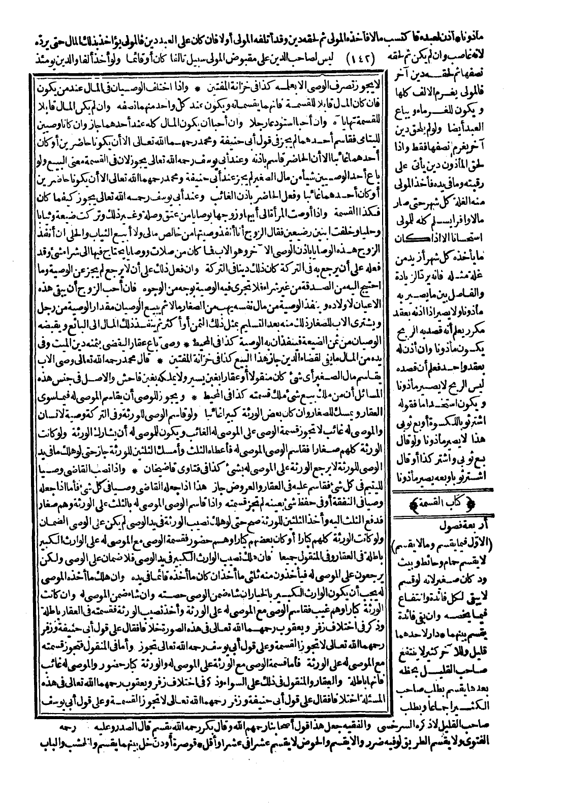 وَلَوْ قَاسَمَ الْوَصِيُّ لِلْوَرَثَةِ وَفِي التَّرِكَةِ وَصِيَّةٌ لِإِنْسَانٍ وَالْمُوصَى لَهُ غَائِبٌ لَا تَجُوزُ قِسْمَةُ الْوَصِيِّ عَلَى الْمُوصَى لَهُ الْغَائِبِ وَيَكُونُ لِلْمُوصَى لَهُ أَنْ يُشَارِكَ الْوَرَثَةَ.