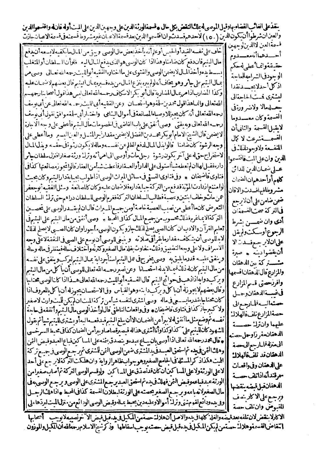 سُئِلَ الْفَقِيهُ أَبُو جَعْفَرٍ عَمَّنْ مَاتَ وَخَلَّفَ ابْنَتَيْنِ وَعُصْبَةً فَطَالَبَ السُّلْطَانُ التَّرِكَةَ فَغَرِمَ الْوَصِيُّ لِلسُّلْطَانِ دَرَاهِمَ حَتَّى تَرَكَ السُّلْطَانُ التَّعَرُّضَ كَانَ مَا أَعْطَى مِنْ نَصِيبَ الْعُصْبَةِ خَاصَّةً أَوْ مِنْ جَمِيعِ الْمِيرَاثِ، قَالَ: إنْ لَمْ يَقْدِرْ الْوَصِيُّ عَلَى تَحْصِينِ التَّرِكَةِ إلَّا بِمَا غَرِمَ فَذَلِكَ مَحْسُوبٌ مِنْ جَمِيعِ الْمَالِ فِي الْمُحِيطِ.
