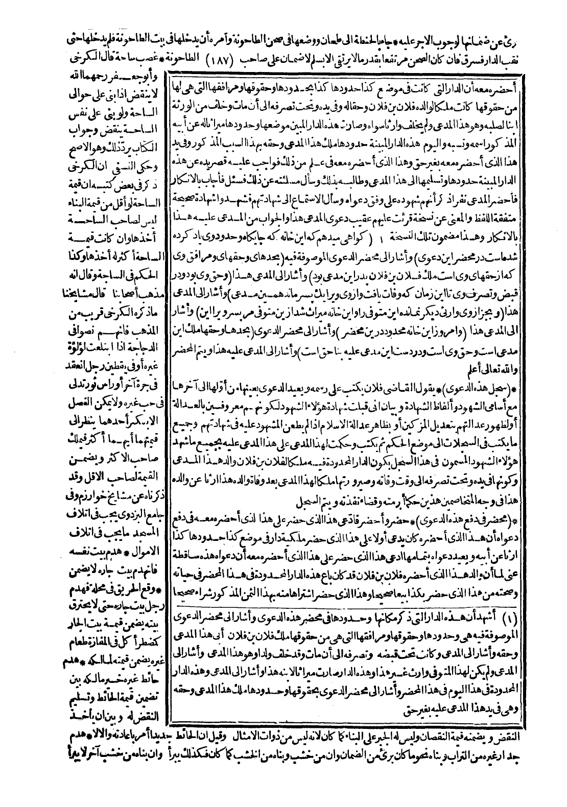 أَحْضَرَهُ مَعَهُ أَنَّ الدَّارَ الَّتِي كَانَتْ فِي مَوْضِعِ كَذَا حُدُودُهَا كَذَا بِحُدُودِهَا وَحُقُوقِهَا، وَمَرَافِقُهَا الَّتِي هِيَ لَهَا مِنْ حُقُوقِهَا كَانَتْ مِلْكًا لِوَالِدِهِ فُلَانِ بْنِ فُلَانٍ وَحَقًّا لَهُ فِي يَدِهِ وَتَحْتَ تَصَرُّفِهِ إلَى أَنْ مَاتَ وَخَلَّفَ مِنْ الْوَرَثَةِ ابْنًا لِصُلْبِهِ وَهُوَ هَذَا الْمُدَّعِي وَلَمْ يُخَلِّفْ وَارِثًا سِوَاهُ وَصَارَتْ هَذِهِ الدَّارُ الْمُبَيَّنُ مَوْضِعُهَا وَحُدُودُهَا مِيرَاثًا لَهُ عَنْ أَبِيهِ الْمَذْكُورِ اسْمُهُ وَنَسَبُهُ، وَالْيَوْمَ هَذِهِ الدَّارُ الْمُبَيَّنَةُ حُدُودُهَا مِلْكُ هَذَا الْمُدَّعِي وَحَقُّهُ بِهَذَا السَّبَبِ الْمَذْكُورِ وَفِي يَدِ هَذَا الَّذِي أَحْضَرَهُ مَعَهُ بِغَيْرِ حَقٍّ، وَهَذَا الَّذِي أَحْضَرَهُ مَعَهُ فِي عِلْمٍ مِنْ ذَلِكَ فَوَاجِبٌ عَلَيْهِ قَصْرُ يَدِهِ عَنْ هَذِهِ الدَّارِ الْمُبَيَّنَةِ حُدُودِهَا وَتَسْلِيمُهَا إلَى هَذَا الْمُدَّعَى، وَطَالَبَهُ بِذَلِكَ وَسَأَلَ مَسْأَلَتَهُ عَنْ ذَلِكَ فَسُئِلَ فَأَجَابَ بِالْإِنْكَارِ، فَأَحْضَرَ الْمُدَّعِي نَفَرًا ذَكَرَ أَنَّهُمْ شُهُودُهُ عَلَى وَفْقِ دَعْوَاهُ وَسَأَلَ الِاسْتِمَاعَ إلَى شَهَادَتِهِمْ، فَشَهِدُوا شَهَادَةً صَحِيحَةً مُتَّفِقَةَ اللَّفْظِ وَالْمَعْنَى عَنْ نُسْخَةٍ قُرِئَتْ عَلَيْهِمْ عَقِيبَ دَعْوَى الْمُدَّعِي هَذَا وَالْجَوَابُ مِنْ الْمُدَّعَى عَلَيْهِ هَذَا بِالْإِنْكَارِ، وَهَذَا مَضْمُونُ تِلْكَ النُّسْخَةِ (كَوَاهِي مَيْدهمْ كه أَيْنَ خَانَهُ كه جايكاه وحدودوى يَا دكرده شَدَّ مَا سِتّ دُرِّ محضراين دَعْوَى) وَأَشَارَ إلَى مَحْضَرِ الدَّعْوَى الْمَوْصُوفَةِ فِيهِ (بحدهاى وحقهاى وَمَرَافِق وى كه ازحقهاي وى است مُلْك فُلَان بْن فُلَان بَدْر أَيْنَ مُدَّعَى بِوُدِّ) وَأَشَارَ إلَى الْمُدَّعِي هَذَا (وَحَقِّ وى بودودر قَبَضَ وَتَصْرِف وى تا أَيْنَ زَمَان كه وَفَاتَ يافت وازوى ويرايك بِسِرِّ مَا ندهمين مُدَّعَى) وَأَشَارَ إلَى الْمُدَّعِي هَذَا (وبجزازوى وارئى ديكر نمانده أَيْنَ مُتَوَفَّى راواين خَانَهُ مِيرَاث شدازين مُتَوَفَّيْ مربسرويرا أَيْنَ) وَأَشَارَ إلَى الْمُدَّعَى هَذَا (وأمروزاين خَانَهُ محدودد رَيْن مَحْضَر) وَأَشَارَ إلَى مَحْضَرِ الدَّعْوَى (بِحَدِّهَا وَحَقِّهَا مُلْك أَيْنَ مُدَّعَى است وَحَقِّ وى است ودردست أَيْنَ مُدَّعَى عَلَيْهِ بنا حَقِّ است) وَأَشَارَ إلَى الْمُدَّعَى عَلَيْهِ هَذَا وَيُتِمُّ الْمَحْضَرَ وَاَللَّهُ تَعَالَى أَعْلَمُ.