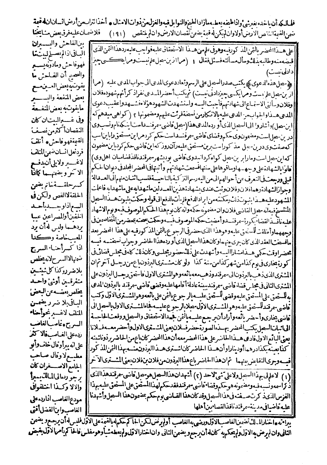 (مَرَّا ازين سِجِلّ عِلْم نِيسَتْ ومرايكسى جيزدادني نِيسَتْ) ثُمَّ يَكْتُبُ أَحْضَرَ الْمُدَّعِي نَفَرًا ذَكَرَ أَنَّهُمْ شُهُودُهُ فُلَانٌ وَفُلَانٌ وَسَأَلَنِي الِاسْتِمَاعَ إلَى شَهَادَتِهِمْ فَأَجَبْت إلَيْهِ وَاسْتَشْهَدْت الشُّهُودَ هَؤُلَاءِ فَشَهِدُوا عَقِيبَ دَعْوَى الْمُدَّعِي هَذَا، وَالْجَوَابُ مِنْ الْمُدَّعَى عَلَيْهِ بِالْإِنْكَارِ مِنْ نُسْخَةٍ قُرِئَتْ عَلَيْهِمْ وَمَضْمُونُهَا (كَواهى مَيْدهمْ كه اين سِجِلّ) وَأَشَارُوا إلَى السِّجِلِّ الَّذِي أَوْرَدَهُ الْمُدَّعِي هَذَا (سِجِلّ قَاضِي سَمَرْقَنْدَ است اينكه نَامَ وَنَسُبّ وى درين سِجِلّ است وَمَضْمُون وى حُكْم وَقَضَايَ قَاضِي سَمَرْقَنْدَ است حُكْم كرد اين مُسْتَحَقّ راباين اسْبِ كه صَفَّتْ وى درين سِجِلّ مَذْكُور است بَرَّيْنِ مُسْتَحَقّ عَلَيْهِ آنِ روزكه ايْن قَاضِي حُكْم كردباين مَضْمُون كه ايْن سِجِلّ است، وَمَا رابرين سِجِلّ كَوَاهُ كَردانيدوى قَاضِي بودبشهر سَمَرْقَنْدَ نَافِذ قضا ميان أَهْل وى) فَأَتَوْا بِالشَّهَادَةِ عَلَى وَجْهِهَا وَسَاقُوهَا عَلَى سُنَنِهَا فَسَمِعْتُ شَهَادَتَهُمْ وَأَثْبَتُّهَا فِي الْمَحْضَرِ الْمُجَلَّدِ فِي دِيوَانِ الْحُكْمِ قِبَلِي وَرَجَعْت فِي التَّعَرُّفِ عَنْ أَحْوَالِهِمْ إلَى مَنْ إلَيْهِ رَسْمُ التَّزْكِيَةِ بِالنَّاحِيَةِ فَنُسِبَ اثْنَانِ مِنْهُمْ إلَى الْعَدَالَةِ وَجَوَازِ الشَّهَادَةِ وَهُمَا فُلَانٌ وَفُلَانٌ، وَثَبَتَ عِنْدِي بِشَهَادَةِ هَذَيْنِ الْمُعَدَّلَيْنِ مَا شَهِدَا بِهِ عَلَى مَا شَهِدَا بِهِ فَأَعْلَمْت الْمَشْهُودَ عَلَيْهِ هَذَا بِثُبُوتِ ذَلِكَ وَمَكَّنْته مِنْ إيرَادِ الدَّفْعِ فَلَمْ يَأْتِ بِالدَّفْعِ إلَى قَوْلِهِ: وَحَكَمْت بِثُبُوتِ هَذَا السِّجِلِّ الْمُنْتَسَخِ فِيهِ أَنَّهُ سِجِلُّ الْقَاضِي فُلَانٌ وَأَنَّ مَضْمُونَهُ حُكْمُهُ، وَأَنَّهُ كَانَ يَوْمَ هَذَا الْحُكْمِ الْمَوْصُوفِ فِيهِ وَيَوْمَ الْإِشْهَادِ عَلَيْهِ نَافِذَ الْقَضَاءِ بِكُورَةِ سَمَرْقَنْدَ وَأَمْضَيْت حُكْمَهُ الْمَوْصُوفَ فِيهِ وَحَكَمْت بِصِحَّتِهِ بِمَحْضَرٍ مِنْ الْمُتَخَاصِمَيْنِ فِي وَجْهِهِمَا وَأَطْلَقْت لِلْمُسْتَحَقِّ عَلَيْهِ.