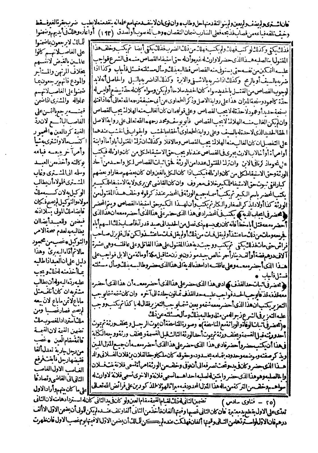 فَسُئِلَ فَأَجَابَ وَكَذَا إذَا ضَرَبَهُ بِالسَّيْفِ أَوْ بِالرُّمْحِ، وَكَذَلِكَ إذَا ضَرَبَهُ بِالْإِشْفَى وَالْإِبْرَةِ، وَكَذَلِكَ إذَا ضَرَبَهُ بِالنِّيلِ، وَالْحَاصِلُ أَنَّهُ لَا بُدَّ لِوُجُوبِ الْقِصَاصِ مِنْ الْقَتْلِ بِالْحَدِيدِ سَوَاءٌ كَانَ الْحَدِيدُ سِلَاحًا أَوْ لَمْ يَكُنْ وَسَوَاءٌ كَانَ لَهُ حِدَةٌ يُبْضِعُ أَوْ لَيْسَ لَهُ حِدَةٌ كَالْعَمُودِ وَسَنْجَةِ الْمِيزَانِ، هَذَا عَلَى رِوَايَةِ الْأَصْلِ وَذَكَرَ الطَّحْطَاوِيُّ عَنْ أَبِي حَنِيفَةَ - رَحِمَهُ اللَّهُ تَعَالَى - أَنَّهُ إذَا قَتَلَهُ بِسَنْجَةِ حَدِيدٍ أَوْ عَمُودٍ لَا حِدَةَ لَهُ لَا يَجِبُ الْقِصَاصُ وَعَلَى قَوْلِهِمَا إنْ كَانَ الْغَالِبُ مِنْهُ الْهَلَاكَ يَجِبُ الْقِصَاصُ، وَإِنْ لَمْ يَكُنْ الْغَالِبُ مِنْهُ الْهَلَاكُ لَا يَجِبُ الْقِصَاصُ، فَأَبُو يُوسُفَ وَمُحَمَّدٌ - رَحِمَهُمَا اللَّهُ تَعَالَى - عَلَى رِوَايَةِ الْأَصْلِ أَلْحَقَا الْحَدِيدَ الَّذِي لَا حِدَةَ لَهُ بِالسَّيْفِ وَعَلَى رِوَايَةِ الطَّحَاوِيِّ أَلْحَقَاهُ بِالْخَشَبِ، وَالْجَوَابُ فِي الْخَشَبِ عِنْدَهُمَا عَلَى التَّفْصِيلِ إنْ كَانَ الْغَالِبُ مِنْهُ الْهَلَاكُ يَجِبُ الْقِصَاصُ وَمَا لَا فَلَا، وَكَذَلِكَ إنْ تَرَكَ الْمَقْتُولُ أَبًا وَأُمًّا أَوْ ابْنَةً أَوْ امْرَأَةً أَوْ أَخًا لِأَبٍ؛ الْإِرْثُ يَجْرِي فِي الْقِصَاصِ عِنْدَنَا وَيَجِبُ حَقُّ الِاسْتِيفَاءِ لِكُلِّ مَنْ كَانَ وَارِثًا لَهُ فَيَكْتُبُ عَلَى نَحْوِ مَا ذَكَرْنَا فِي الِابْنِ، وَإِنْ تَرَكَ الْمَقْتُولُ عَدَدًا مِنْ الْوَرَثَةِ فَحَقُّ إثْبَاتِ الْقِصَاصِ لِكُلِّ وَاحِدٍ مِنْ آحَادِ الْوَرَثَةِ وَحَقُّ الِاسْتِيفَاءِ لِكُلِّ مَنْ كَانَ وَارِثًا لَهُ فَيَكْتُبُ إذَا كَانَ الْكُلُّ بَالِغِينَ، وَإِنْ كَانَ بَعْضُهُمْ صِغَارًا وَبَعْضُهُمْ كِبَارًا فَفِي ثُبُوتِ حَقِّ الِاسْتِيفَاءِ لِلْكَبِيرِ خِلَافٌ مَعْرُوفٌ.