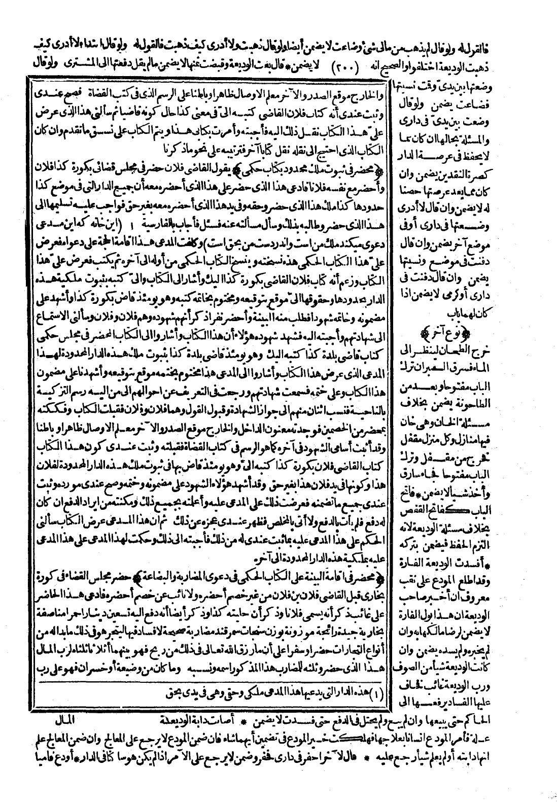 (مَحْضَرٌ فِي إقَامَةِ الْبَيِّنَةِ عَلَى الْكِتَابِ الْحُكْمِيِّ فِي دَعْوَى الْمُضَارَبَةِ وَالْبِضَاعَةِ) حَضَرَ مَجْلِسَ الْقُضَاةِ فِي كُورَةِ بُخَارَى قِبَلَ الْقَاضِي فُلَانِ بْنِ فُلَانٍ مِنْ غَيْرِ خَصْمٍ أَحْضَرَهُ وَلَا نَائِبٍ عَنْ خَصْمٍ أَحْضَرَهُ فَادَّعَى هَذَا الْحَاضِرُ عَلَى غَائِبٍ ذَكَرَ أَنَّهُ يُسَمَّى فُلَانًا، وَذَكَرَ أَنَّ حِلْيَتَهُ كَذَا، وَذَكَرَ أَيْضًا أَنَّهُ دَفَعَ إلَيْهِ تِسْعِينَ دِينَارًا حُمْرًا مُنَاصَفَةً بُخَارِيَّةً جَيِّدَةً رَائِجَةً مَوْزُونَةً بِوَزْنِ سَنَجَاتِ سَمَرْقَنْدَ مُضَارَبَةً صَحِيحَةً لَا فَسَادَ فِيهَا لِيَتَّجِرَ هُوَ فِي ذَلِكَ مَا بَدَا لَهُ مِنْ أَنْوَاعِ التِّجَارَاتِ حَضَرًا أَوْ سَفَرًا عَلَى أَنَّ مَا رَزَقَ اللَّهُ تَعَالَى فِي ذَلِكَ مِنْ رِبْحٍ فَهُوَ بَيْنَهُمَا أَثْلَاثًا ثُلُثَاهُ لِرَبِّ الْمَالِ هَذَا الَّذِي حَضَرَ وَثُلُثُهُ لِلْمُضَارِبِ هَذَا الْمَذْكُورِ اسْمُهُ وَنَسَبُهُ وَمَا كَانَ مِنْ وَضِيعَةٍ أَوْ خُسْرَانٍ فَهُوَ عَلَى رَبِّ