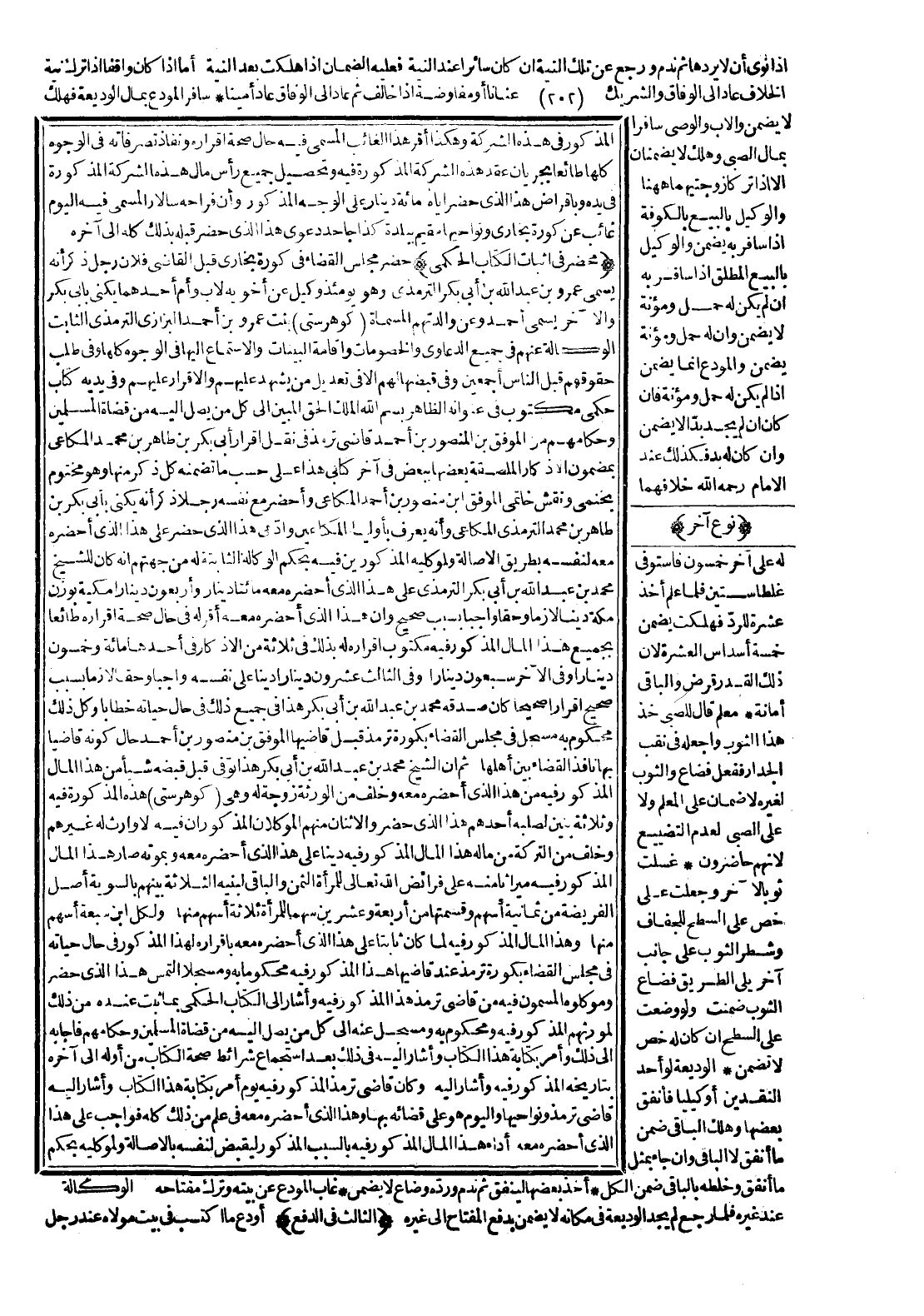 وَكُلُّ ذَلِكَ مَحْكُومٌ بِهِ مُسَجَّلٌ فِي مَجْلِسِ الْقَضَاءِ بِكُورَةِ تِرْمِذَ قِبَلَ قَاضِيهَا الْمُوَفَّقِ بْنِ مَنْصُورِ بْنِ أَحْمَدَ حَالَ كَوْنِهِ قَاضِيًا بِهَا نَافِذَ الْقَضَاءِ بَيْنَ أَهْلِهَا، ثَمَّ إنَّ الشَّيْخَ مُحَمَّدَ بْنَ عَبْدِ اللَّهِ بْنِ أَبِي بَكْرٍ هَذَا تُوُفِّيَ قَبْلَ قَبْضِهِ شَيْئًا مِنْ هَذَا الْمَالِ الْمَذْكُورِ فِيهِ مِنْ هَذَا الَّذِي أَحْضَرَهُ مَعَهُ وَخَلَّفَ مِنْ الْوَرَثَةِ زَوْجَةً لَهُ، وَهِيَ (كوهرستي) هَذِهِ الْمَذْكُورَةُ فِيهِ وَثَلَاثَةَ بَنِينَ لِصُلْبِهِ، أَحَدُهُمْ هَذَا الَّذِي حَضَرَ وَالِاثْنَانِ مِنْهُمْ الْمُوَكِّلَانِ الْمَذْكُورَانِ فِيهِ لَا وَارِثَ لَهُ غَيْرُهُمْ وَخَلَّفَ مِنْ التَّرِكَةِ مِنْ مَالِهِ هَذَا الْمَالَ الْمَذْكُورَ فِيهِ دَيْنًا عَلَى هَذَا الَّذِي أَحْضَرَهُ مَعَهُ وَبِمَوْتِهِ صَارَ هَذَا الْمَالُ الْمَذْكُورُ فِيهِ مِيرَاثًا مِنْهُ عَلَى فَرَائِضِ اللَّهِ تَعَالَى، لِلْمَرْأَةِ الثُّمُنُ وَالْبَاقِي لِبَنِيهِ الثَّلَاثَةِ بَيْنَهُمْ بِالسَّوِيَّةِ، أَصْلُ الْفَرِيضَةِ مِنْ ثَمَانِيَةِ أَسْهُمٍ وَقِسْمَتُهَا مِنْ أَرْبَعَةٍ وَعِشْرِينَ سَهْمًا: لِلْمَرْأَةِ ثَلَاثَةُ أَسْهُمٍ مِنْهَا، وَلِكُلِّ ابْنٍ سَبْعَةُ أَسْهُمٍ مِنْهَا، وَهَذَا الْمَالُ الْمَذْكُورُ فِيهِ لَمَّا كَانَ ثَابِتًا عَلَى هَذَا الَّذِي أَحْضَرَهُ مَعَهُ بِإِقْرَارِهِ لِهَذَا الْمَذْكُورِ فِي حَالِ حَيَاتِهِ فِي مَجْلِسِ الْقَضَاءِ بِكُورَةِ تِرْمِذَ عِنْدَ قَاضِيهَا هَذَا الْمَذْكُورِ فِيهِ مَحْكُومًا بِهِ وَمُسَجَّلًا الْتَمَسَ هَذَا الَّذِي حَضَرَ وَمُوَكِّلُوهُ الْمُسَمَّوْنَ فِيهِ مِنْ قَاضِي تِرْمِذَ هَذَا الْمَذْكُورِ فِيهِ.