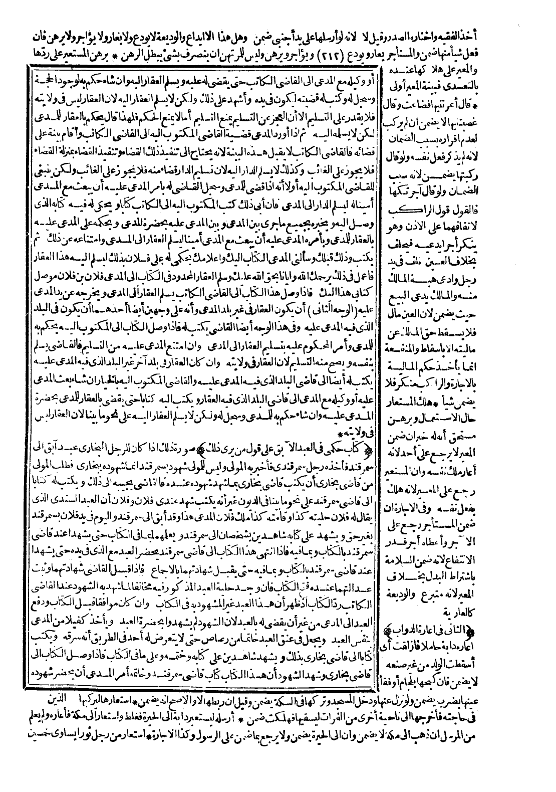 فَإِنْ أَبَى ذَلِكَ كَتَبَ الْمَكْتُوبُ إلَيْهِ إلَى الْكَاتِبِ كِتَابًا يَحْكِي لَهُ فِيهِ كِتَابَهُ الَّذِي وَصَلَ إلَيْهِ وَيُخْبِرُهُ بِجَمِيعِ مَا جَرَى بَيْنَ الْمُدَّعِي وَبَيْنَ الْمُدَّعَى عَلَيْهِ بِحَضْرَةِ الْمُدَّعِي وَبِحُكْمِهِ عَلَى الْمُدَّعَى عَلَيْهِ بِالْعَقَارِ لِلْمُدَّعِي وَبِأَمْرِهِ الْمُدَّعَى عَلَيْهِ أَنْ يَبْعَثَ مَعَ الْمُدَّعِي أَمِينًا لِيُسَلِّمَ الْعَقَارَ إلَى الْمُدَّعِي وَامْتِنَاعِهِ عَنْ ذَلِكَ، ثُمَّ يَكْتُبُ، وَذَلِكَ قِبَلَكَ، وَسَأَلَنِي الْمُدَّعِي الْكِتَابَ إلَيْكَ وَإِعْلَامَكَ بِحُكْمِي لَهُ عَلَى فُلَانٍ بِذَلِكَ لِيُسَلِّمَ إلَيْهِ هَذَا الْعَقَارَ فَاعْمَلْ فِي ذَلِكَ يَرْحَمُكَ اللَّهُ وَإِيَّانَا بِحَقِّ اللَّهِ عَلَيْكَ وَسَلِّمْ الْعَقَارَ الْمَحْدُودَ فِي الْكِتَابِ إلَى الْمُدَّعِي فُلَانِ بْنِ فُلَانٍ مُوَصِّلِ كِتَابِي هَذَا إلَيْكَ فَإِذَا وَصَلَ هَذَا الْكِتَابُ إلَى الْقَاضِي الْكَاتِبِ يُسَلِّمُ الْعَقَارَ إلَى الْمُدَّعِي وَيُخْرِجُهُ عَنْ يَدِ الْمُدَّعَى عَلَيْهِ.