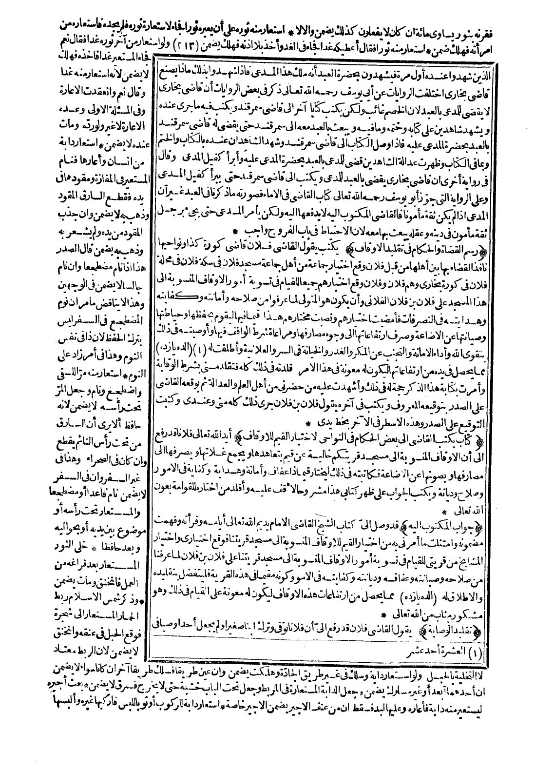 (الده يازده) مِمَّا يَحْصُلُ فِي يَدِهِ مِنْ ارْتِفَاعَاتِهَا لِيَكُونَ لَهُ مَعُونَةٌ فِي هَذَا الْأَمْرِ قَلَّدْتُهُ فِي ذَلِكَ كُلِّهِ فَتَقَلَّدَ مِنِّي بِشَرْطِ الْوِقَايَةِ، وَأَمَرْتُ بِكِتَابَةِ هَذَا الذِّكْرِ حُجَّةً لَهُ فِي ذَلِكَ وَأَشْهَدْتُ عَلَيْهِ مَنْ حَضَرَنِي مِنْ أَهْلِ الْعِلْمِ وَالْعَدَالَةِ، ثُمَّ يُوَقِّعُهُ الْقَاضِي عَلَى الصَّدْرِ بِتَوْقِيعِهِ الْمَعْرُوفِ وَيَكْتُبُ فِي آخِرِهِ: يَقُولُ فُلَانُ بْنُ فُلَانٍ: جَرَى ذَلِكَ كُلُّهُ مِنِّي وَعِنْدِي وَكَتَبْتُ التَّوْقِيعَ عَلَى الصَّدْرِ، وَهَذِهِ الْأَسْطُرُ فِي الْآخِرِ بِخَطِّ يَدَيَّ.