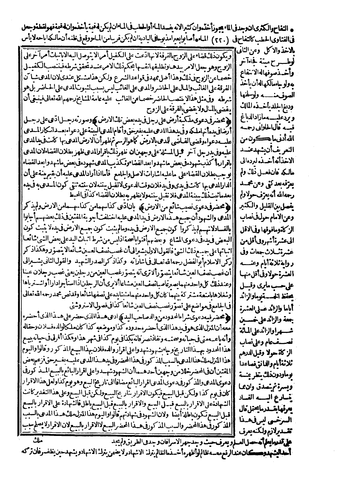 (مَحْضَرٌ فِي دَعْوَى مِلْكِيَّةِ أَرْضٍ عَلَى رَجُلٍ فِي يَدِهِ بَعْضُ تِلْكَ الْأَرْضِ) وَصُورَتُهُ رَجُلٌ ادَّعَى عَلَى رَجُلٍ أَرْضًا فِي يَدِهِ أَنَّهَا مِلْكُهُ، وَفِي يَدِ هَذَا الْمُدَّعَى عَلَيْهِ بِغَيْرِ حَقٍّ وَأَقَامَ الْمُدَّعِي الْبَيِّنَةَ عَلَى دَعْوَاهُ بَعْدَ إنْكَارِ الْمُدَّعَى عَلَيْهِ دَعْوَاهُ وَقَضَى الْقَاضِي لِلْمُدَّعِي بِالْأَرْضِ كَمَا هُوَ الرَّسْمُ، ثُمَّ ظَهَرَ أَنَّ الْأَرْضَ الْمُدَّعَى بِهَا كَانَتْ فِي يَدِ الْمُدَّعَى عَلَيْهِ، وَفِي يَدِ رَجُلٍ آخَرَ، قِيلَ: الْمَسْأَلَةُ عَلَى وَجْهَيْنِ: إنْ ظَهَرَ ذَلِكَ بِإِقْرَارِ الْمُدَّعِي ظَهَرَ بُطْلَانُ الْقَضَاءِ؛ لِأَنَّ الْمُدَّعِيَ بِإِقْرَارِهِ أَكْذَبَ شُهُودَهُ فِي بَعْضِ مَا شَهِدُوا بَعْدَ الْقَضَاءِ وَتَكْذِيبُ الْمُدَّعِي شُهُودَهُ فِي بَعْضِ مَا شَهِدُوا بَعْدَ الْقَضَاءِ يُوجِبُ بُطْلَانَ الْقَضَاءِ عَلَى مَا عَلَيْهِ إشَارَاتُ الْأَصْلِ وَالْجَامِعِ. فَأَمَّا إذَا أَرَادَ الْمُدَّعَى عَلَيْهِ أَنْ يُقِيمَ بَيِّنَةً عَلَى أَنَّ الدَّارَ الْمُدَّعَى بِهَا كَانَتْ فِي يَدَيَّ وَفِي يَدِ فُلَانٍ وَقْتَ الدَّعْوَى لَا تُقْبَلُ بَيِّنَتُهُ؛ لِأَنَّ بَيِّنَتَهُ تَنْفِي كَوْنَ الْمُدَّعَى بِهِ فِي يَدِهِ بَعْدَمَا ثَبَتَ ذَلِكَ بِبَيِّنَةِ الْمُدَّعِي فَلَا تُقْبَلُ بَيِّنَتُهُ، وَلَا يَظْهَرُ بِهِ بُطْلَانُ الْقَضَاءِ كَذَا فِي الْمُحِيطِ.