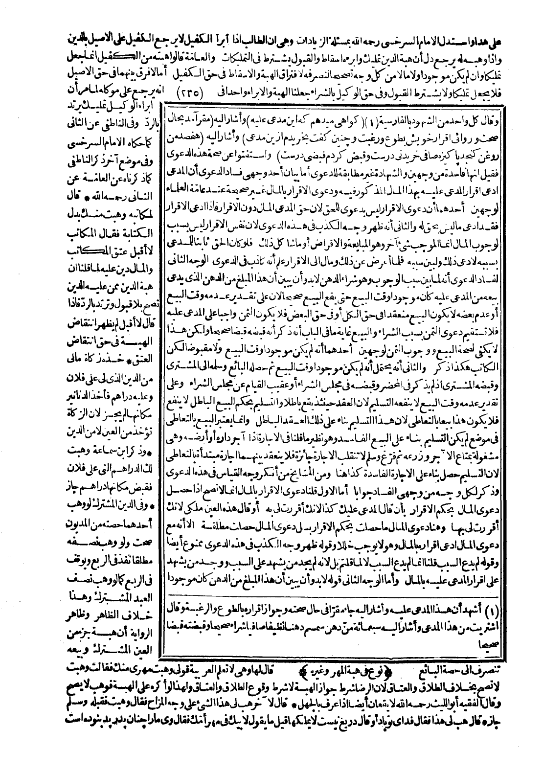 وَقَالَ كُلُّ وَاحِدٍ مِنْ الشُّهُودِ بِالْفَارِسِيَّةِ (كواهي ميدهم كه أَيْنَ مُدَّعَى عَلَيْهِ) ، وَأَشَارَ إلَيْهِ (مُقِرّ آمُدّ بِحَالٍ صَحَّتْ وروائي إقْرَار خويش بطوع وَرَغِبْتُ وَجَنِين كَفَتْ بخريدم إزين مَدْعِيٌّ) ، وَأَشَارَ إلَيْهِ (هفصد مِنْ روغن كنجدبا كيزه صَافِّي خريدني دَرَسْتُ وَقَبض كردم قبضي دَرَسْتُ) وَاسْتَفْتَوْا عَنْ صِحَّةِ هَذِهِ الدَّعْوَى، فَقِيلَ: إنَّهَا فَاسِدَةٌ مِنْ وَجْهَيْنِ وَالشَّهَادَةُ غَيْرُ مُطَابِقَةٍ لِلدَّعْوَى. أَمَّا بَيَانُ أَحَدِ وَجْهَيْ فَسَادِ الدَّعْوَى أَنَّ الْمُدَّعِيَ ادَّعَى إقْرَارَ الْمُدَّعَى عَلَيْهِ بِهَذَا الْمَالِ الْمَذْكُورِ فِيهِ، وَدَعْوَى الْإِقْرَارِ بِالْمَالِ غَيْرُ صَحِيحَةٍ عِنْدَ عَامَّةِ الْعُلَمَاءِ لِوَجْهَيْنِ: أَحَدُهُمَا - أَنَّ دَعْوَى الْإِقْرَارِ لَيْسَ بِدَعْوَى لِلْحَقِّ؛ لِأَنَّ حَقَّ الْمُدَّعِي الْمَالُ دُونَ الْإِقْرَارِ، فَإِذَا ادَّعَى الْإِقْرَارَ فَقَدْ ادَّعَى مَا لَيْسَ بِحَقٍّ لَهُ.